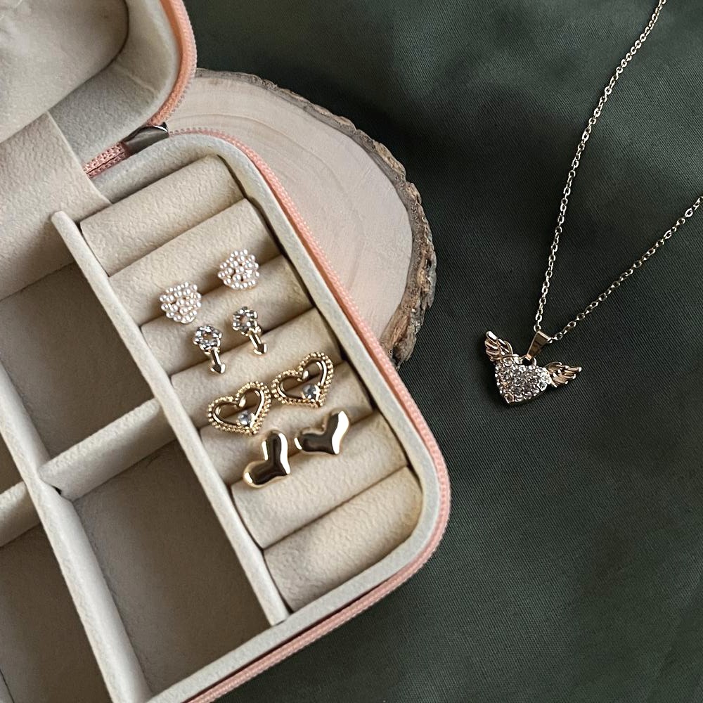 Store the jewelry set in a dry box and wipe gently with a soft cloth after wear. Avoid moisture and fragrances to help preserve the pearl shine and 18K gold plated finish.