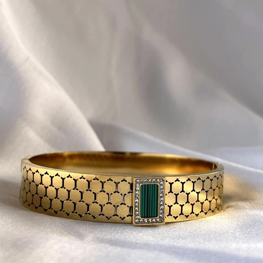 The kada features emerald green zirconia stones crafted for durability and consistent brilliance.