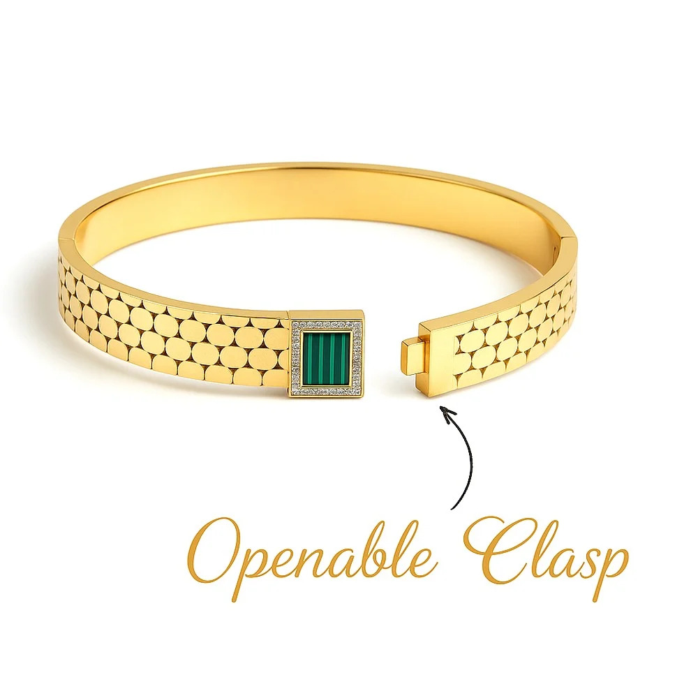 Striking in color and confident in form, the 18K Gold Plated Emerald Green Zirconia Kada is designed to make an impression. Crafted from stainless steel and finished in a radiant gold tone, this kada features emerald green zirconia that catches light with refined brilliance. The structured silhouette balances traditional inspiration with contemporary polish. It’s a piece that speaks of elegance, confidence, and enduring style.