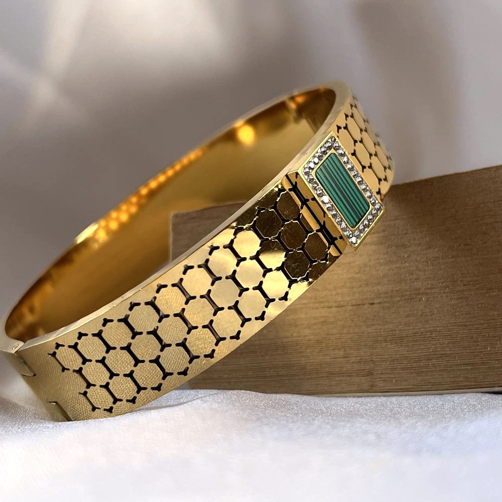 Emerald green zirconia set in sleek 18K gold provides regal appeal in this classic kada, perfect for celebrations. Packed and quality checked by Indianshelf. Regal Emerald Zirconia Essence Emerald green zirconia set in sleek 18K gold provides regal appeal in this classic kada, perfect for celebrations. Classic kada set with emerald green zirconia along an 18K gold-plated band Entirely handmade no machines used Hypoallergenic finish ensures regal elegance for special occasions Composition and Stone Details Origin: India. Safely packed and quality checked by Indianshelf Entirely handmade no machines used Every product comes with verified hallmarks and an official certificate of authenticity for your assurance. Emerald zircons line the sturdy band for a refined look Regal Styling Ideas Wear to weddings or traditional functions for regal elegance Gift to a loved one celebrating cultural events Display in high-end boutiques for special occasion collections Use by stylists for heritage-themed photo shoots Emerald Zirconia Care Tips Gently clean the stones and metal with a dry cloth; keep away from moisture and cosmetics; store in a padded box. Regal Zirconia Kada FAQ Are the emerald stones genuine They are quality zirconia crafted to resemble emeralds. Will the stones fall out They are securely set for long-term wear. Is this bracelet heavy It has a substantial feel but remains comfortable. Can it be resized The kada has an adjustable opening for a custom fit. Handcrafted Regal Artistry Every piece reflects heritage artistry and careful attention to detail. All our products are handmade never machine-made ensuring individuality.