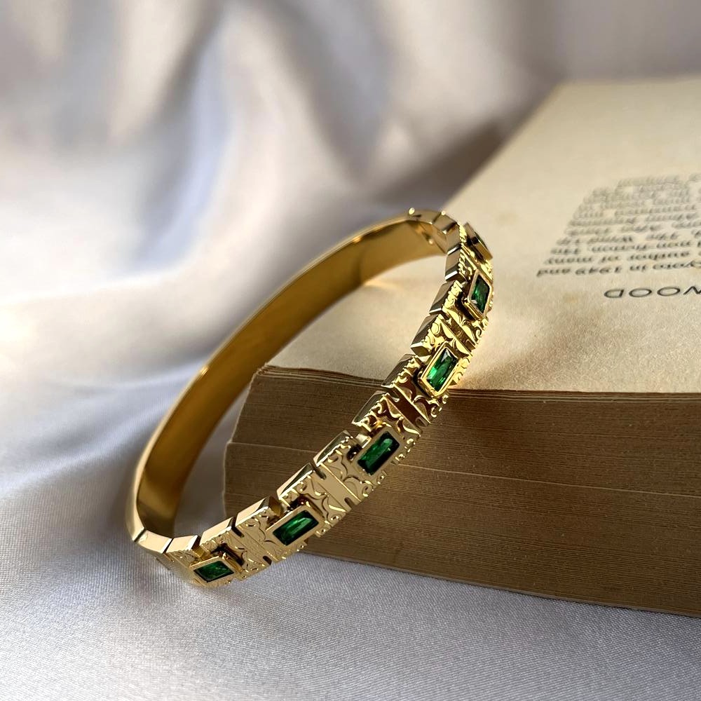 Vibrant emerald stones and an adjustable silhouette make this statement kada a focal point for any outfit. Packed and quality checked by Indianshelf. Emerald Statement Kada Details Vibrant emerald stones and an adjustable silhouette make this statement kada a focal point for any outfit. Vibrant emerald stones highlight an adjustable 18K gold-plated kada Entirely handmade no machines used Designed to be a standout centerpiece while remaining comfortable Design Specs & Fit Origin: India. Safely packed and quality checked by Indianshelf Entirely handmade no machines used Every product comes with verified hallmarks and an official certificate of authenticity for your assurance. Adjustable sizing ensures statement piece fits comfortably Statement Styling & Occasions Highlight evening or festive outfits with this standout kada Gift to someone who loves bold stones Feature in luxury jewellery counters Include in styling for gala events or stage performances Statement Stone Care Advice Wipe the stones and band carefully; avoid water and perfumes to maintain brilliance; store separately. Emerald Statement FAQ Does this statement kada suit small wrists Its adjustable design fits a range of sizes. Is it comfortable for daily wear Despite its boldness, it is designed for comfort. Are the stones stable Yes, they are set securely. Can men wear this Its unisex style allows anyone to enjoy it. Artisan Statement Craft Every piece reflects heritage artistry and careful attention to detail. All our products are handmade never machine-made ensuring individuality.