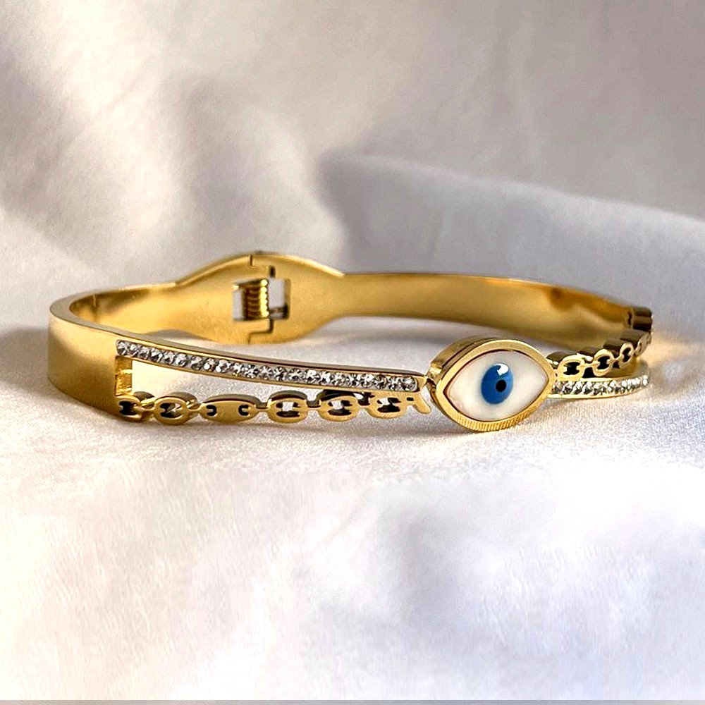 Avoid exposure to water and chemicals, and style it solo or with minimal gold-toned pieces to keep the evil eye motif in focus.