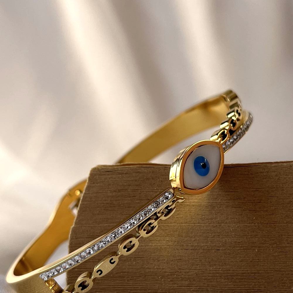An evil eye charm framed by shimmering zirconia adds spiritual elegance to this adjustable kada. Packed and quality checked by Indianshelf. Evil Eye Zirconia Kada Craft An evil eye charm framed by shimmering zirconia adds spiritual elegance to this adjustable kada. Evil eye charm outlined by shimmering zirconia on a sleek gold-plated kada Entirely handmade no machines used Adjustable and hypoallergenic for modern spiritual glamor Material Focus & Dimensions Origin: India. Safely packed and quality checked by Indianshelf Entirely handmade no machines used Every product comes with verified hallmarks and an official certificate of authenticity for your assurance. Adjustable chain provides easy fit and symbolic charm Spiritual Glam Usage Wear daily for subtle spirituality and glamour Gift to friends seeking protective accessories Sell in spiritual or lifestyle stores Style for modern meets traditional events Evil Eye Kada Care Clean gently with a soft cloth; avoid water and chemicals; store individually to prevent scratches. Evil Eye Zirconia Kada FAQ Is the evil eye charm removable It is fixed to the bracelet. Does the bracelet feel heavy No, it's lightweight and comfortable. Is it adjustable Yes, it fits various wrist sizes. Does the zirconia shine brightly Yes, it adds sparkle to the protective charm. Spiritual Handcrafted Glamour Every piece reflects heritage artistry and careful attention to detail. All our products are handmade never machine-made ensuring individuality.