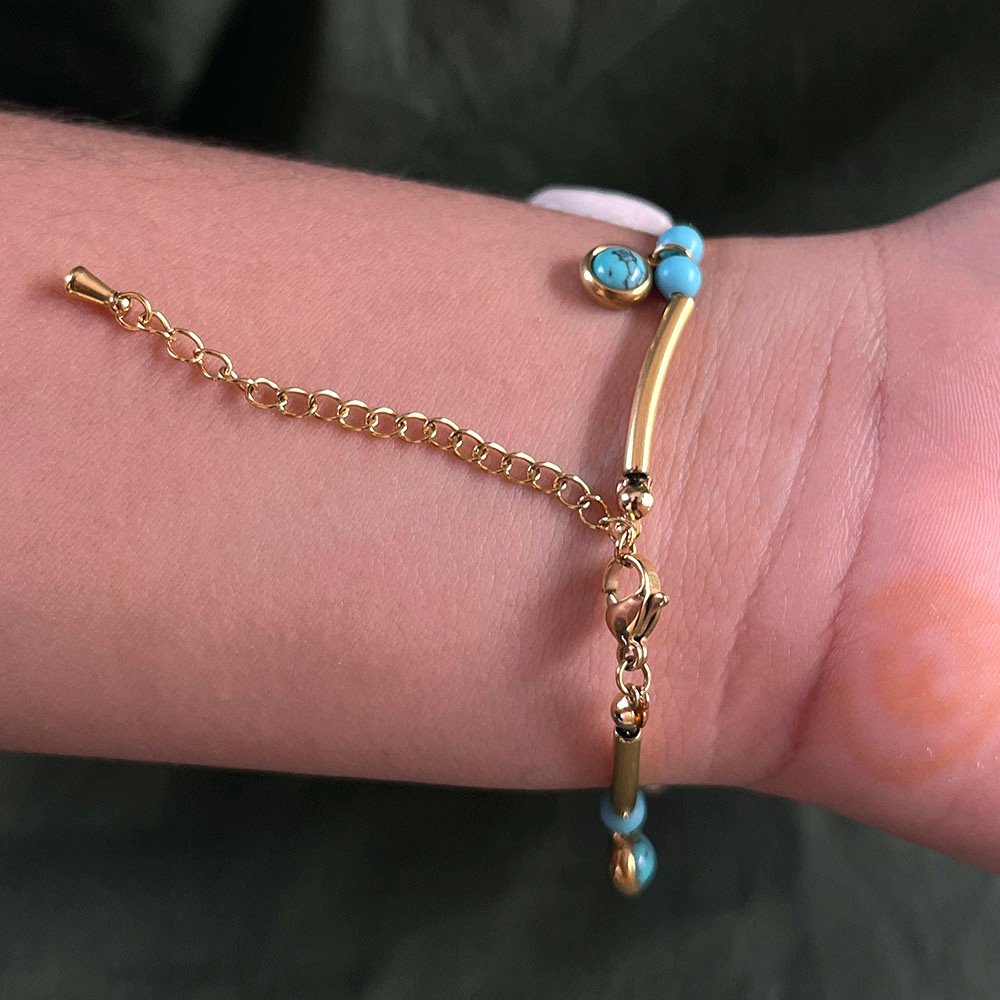 Fresh, luminous, and rooted in natural symbolism, the 18K Gold Plated Firoza Shell Stone Bracelet brings a touch of serenity to everyday styling. Crafted from stainless steel and finished in a warm gold tone, the bracelet features a firoza-hued shell stone that recalls the calm of water and open skies. The contrast between cool blue tones and polished gold feels effortless and balanced. It’s a piece that soothes the eye while elevating the wrist.