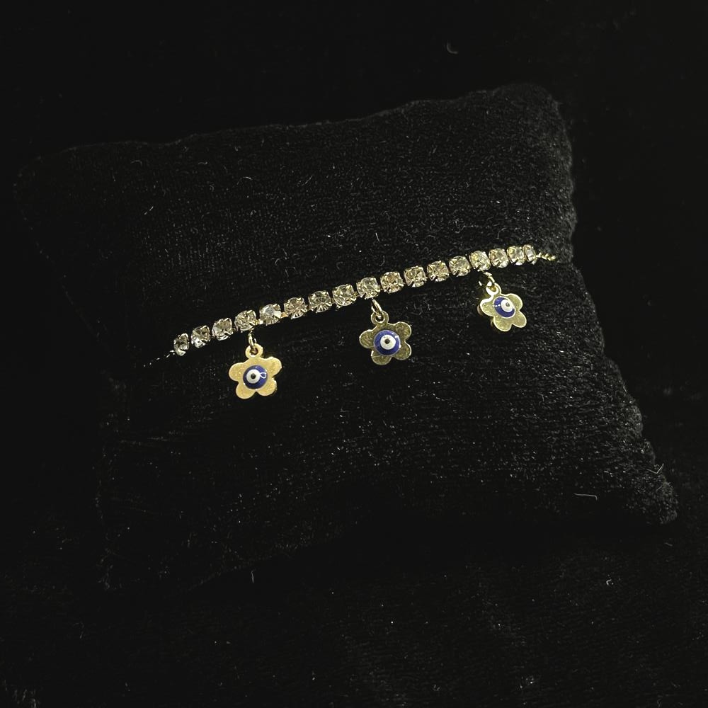 Dazzling stones arranged in a tennis Bracelet style meet protective evil eye symbols for meaningful beauty with sparkle. Packed and quality checked by Indianshelf. Protective Tennis Design Highlights Dazzling stones arranged in a tennis style Bracelet meet protective evil eye symbols for meaningful beauty with sparkle. Combines floral motifs and protective evil eye symbols along a tennis bracelet design in 18K gold Entirely handmade no machines used Quality stones and plating deliver lasting beauty and meaning Specifications & Details Origin: India. Safely packed and quality checked by Indianshelf Entirely handmade no machines used Every product comes with verified hallmarks and an official certificate of authenticity for your assurance. Tennis bracelet style with meaningful symbols suits special occasions Meaningful Uses & Styling Wear to add sparkle with a protective symbol Gift for milestones or heartfelt moments Include in high-end retail collections Use by stylists in cultural or evening events Caring for the Tennis Bracelet Clean stones and settings carefully; store in a lined box and keep away from moisture. FAQ About the Tennis Bracelet Are the floral motifs and evil eyes separate They are integrated into the bracelet design. Is this a heavy piece The bracelet is lightweight and comfortable. Can it be worn to formal events Yes, its elegant style suits formal wear. Does it require special care Store it separately and clean gently to maintain shine. Artisan Integrity Every piece reflects heritage artistry and careful attention to detail. All our products are handmade never machine-made ensuring individuality.