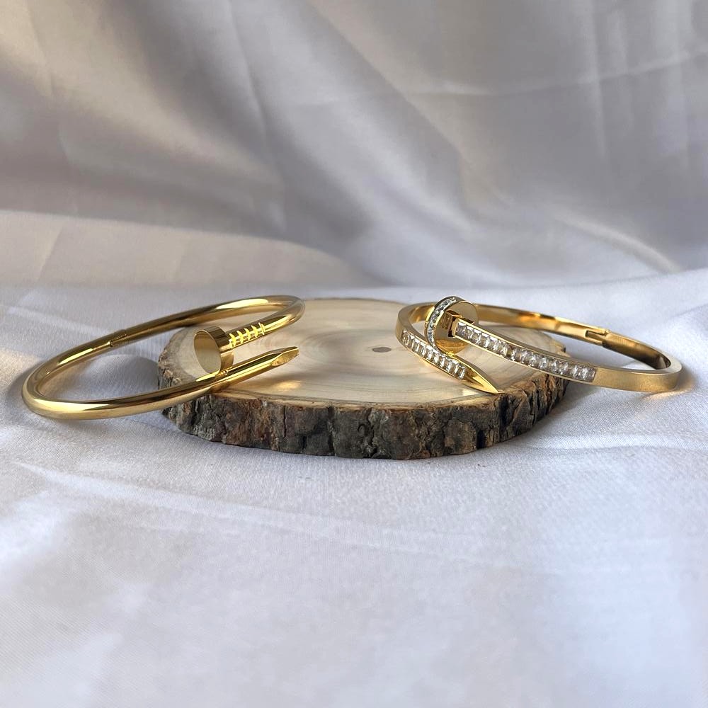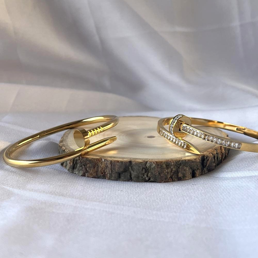 The 18K Gold Plated Nail & CZ Kada Set is a refined blend of modern design and everyday elegance. Crafted from durable stainless steel and finished with rich 18K gold plating, this set features a bold nail-inspired silhouette enhanced with shimmering CZ stones. The structured form offers a confident wrist presence while maintaining a sleek, polished look. Designed for those who appreciate contemporary luxury, this kada set feels stylish, powerful, and timeless.