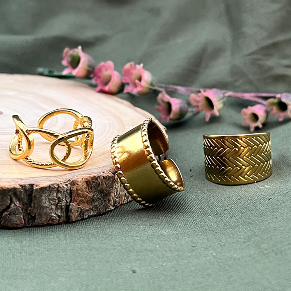 The 18K Gold Plated Statement Three Piece Ring Set is designed to make an impact through form rather than excess. Crafted from durable stainless steel and finished with rich 18K gold plating, each ring carries a distinct presence while remaining refined. Together, the three pieces create a sculptural rhythm of shine and structure. Worn as a set or styled individually, they offer confident expression with everyday comfort.