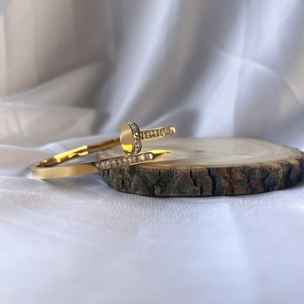 Studded details elevate the nail-inspired motif on this kada, offering a striking mix of texture and shine. Packed and quality checked by Indianshelf. Studded Nail Bracelet Details Studded details elevate the nail-inspired motif on this kada, offering a striking mix of texture and shine. Nail-inspired kada adorned with shimmering studs and finished in 18K gold Entirely handmade no machines used Adjustable fit and hypoallergenic finish for stylish versatility Build & Fit Details Origin: India. Safely packed and quality checked by Indianshelf Entirely handmade no machines used Every product comes with verified hallmarks and an official certificate of authenticity for your assurance. Studded design offers adjustable fit for comfort and style Edgy and Elegant Usage Pair with evening wear for a touch of sparkle and edge Gift to someone who loves nail-inspired pieces Curate in jewellery boutiques specialising in contemporary designs Style for runway shows or high-fashion parties Studded Kada Maintenance Wipe studs and plating with a soft cloth; avoid contact with rough surfaces and chemicals; store individually. Studded Nail Kada FAQ Are the studs secure Yes, they are firmly set into the metal. Does the kada fit different wrist sizes The adjustable design allows a comfortable fit. Is it heavy No, it is lightweight despite the studs. Can men wear this Its edgy design appeals to all genders. Heritage Craft Commitment Every piece reflects heritage artistry and careful attention to detail. All our products are handmade never machine-made ensuring individuality.
