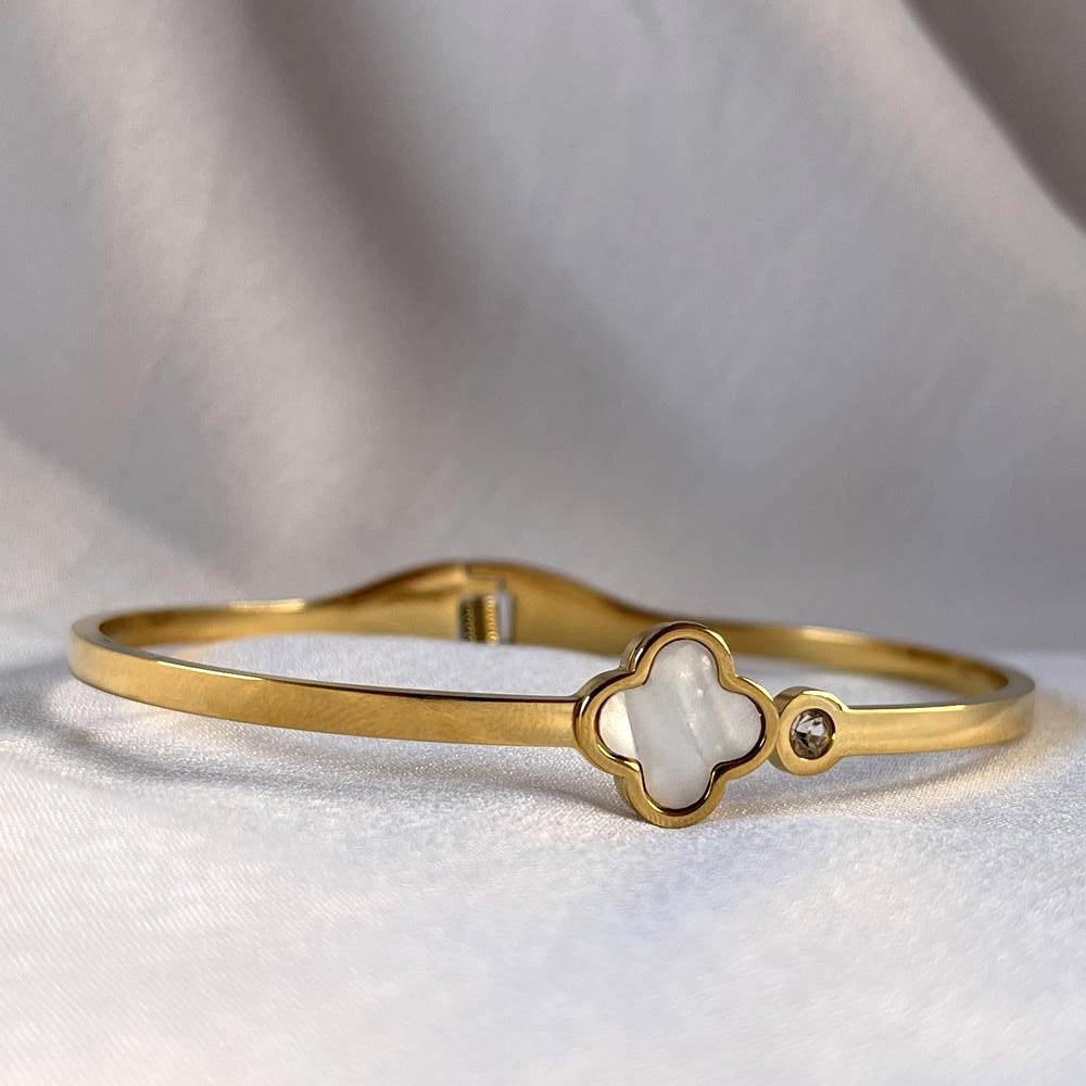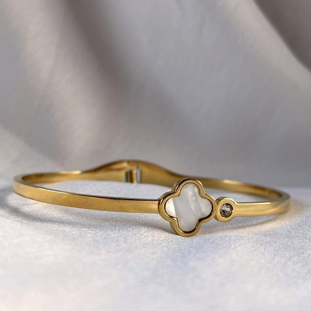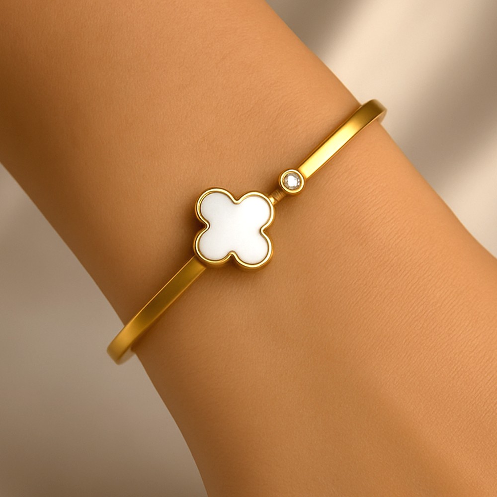 White enamel and sparkling zirconia echo iconic Cleef motifs in this graceful kada. Packed and quality checked by Indianshelf.