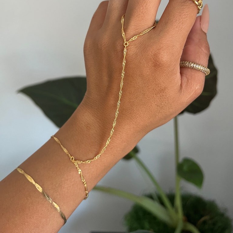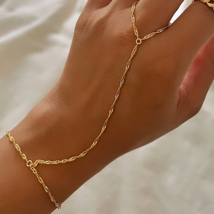 This 18K GP Singapore Ring Bracelet is a refined hand-chain design crafted for women who love dainty, elegant jewelry with a contemporary twist. Made from premium brass and finished with a luminous 18K gold plating, the bracelet connects gracefully from finger to wrist with a beautifully twisted Singapore-style chain. Handmade by skilled artisans, it offers a lightweight, feminine accessory that brings subtle glamour to everyday and special-occasion looks.