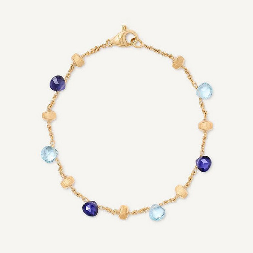 Vibrant, elegant, and beautifully handcrafted this 22K gold plated gemstone Marco Bicego bracelet features a refined mix of Iolite and Blue Topaz, creating a dynamic play of deep indigo and bright aqua tones. Each faceted stone is delicately spaced with brushed gold beads, offering a luxurious yet lightweight design suitable for everyday or occasion wear.