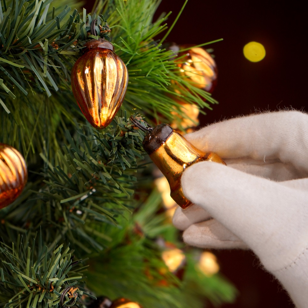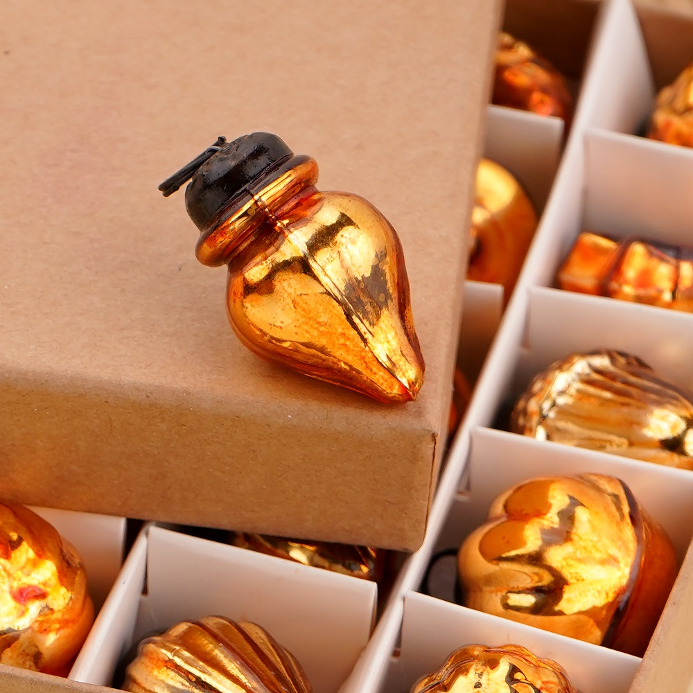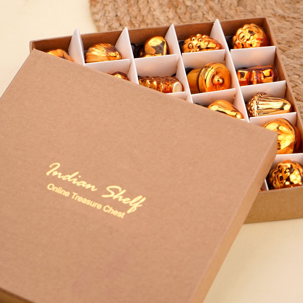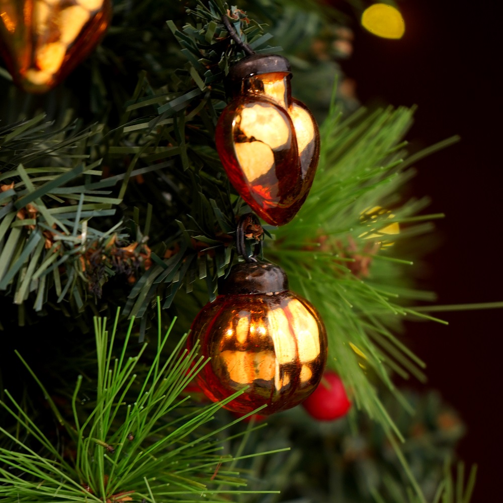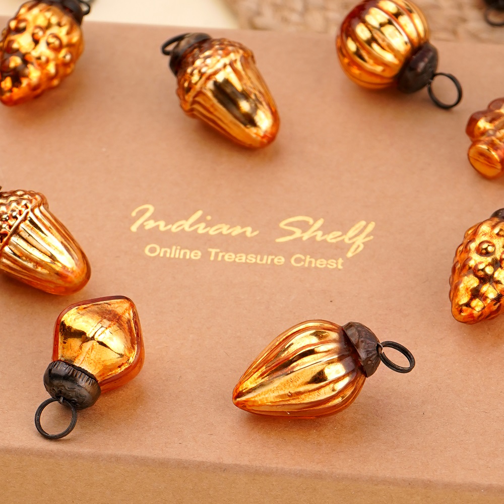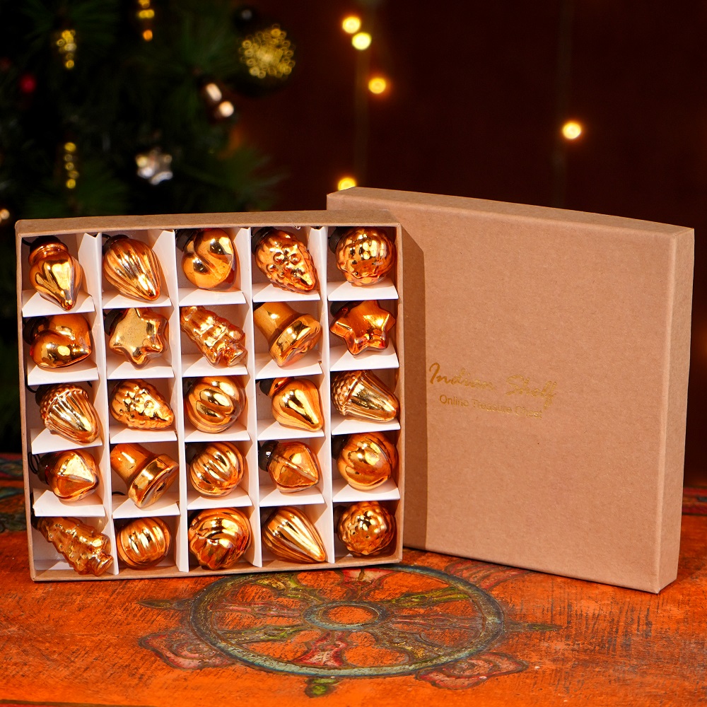 Buy a set of 25 Amber glass Christmas ornaments which are unique and handcrafted masterpiece. Crafted by highly skilled Indian artisans, these ornaments are a celebration of craftsmanship, tradition, and elegance. These stunning ornaments come in a variety of shapes, from classic spheres to intricate designs, ensuring a diverse and captivating display on your Christmas tree. The lush green and gleaming golden colours blend harmoniously, adding a touch of opulence to your holiday decorations. Versatile and enchanting, these ornaments aren't just limited to Christmas. They make a delightful addition to weddings, bridal showers, and other special occasions, elevating the ambiance with their radiant charm. Hang them in your home or garden to infuse every space with a touch of festive cheer. These handcrafted treasures also make for exceptional gifts. Share the joy and craftsmanship with your loved ones on special or festive occasions, leaving a lasting impression of your thoughtfulness and appreciation for beauty..