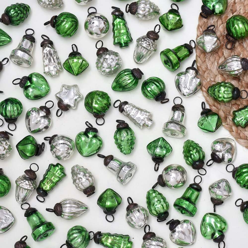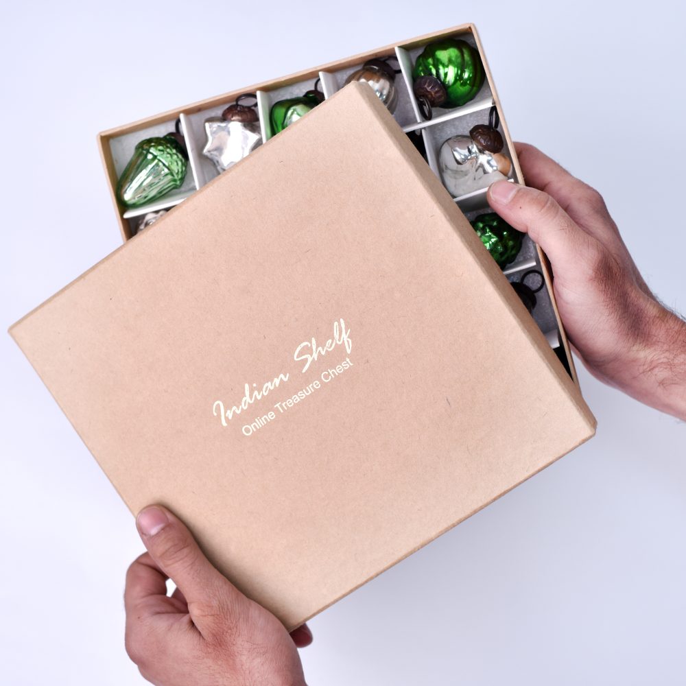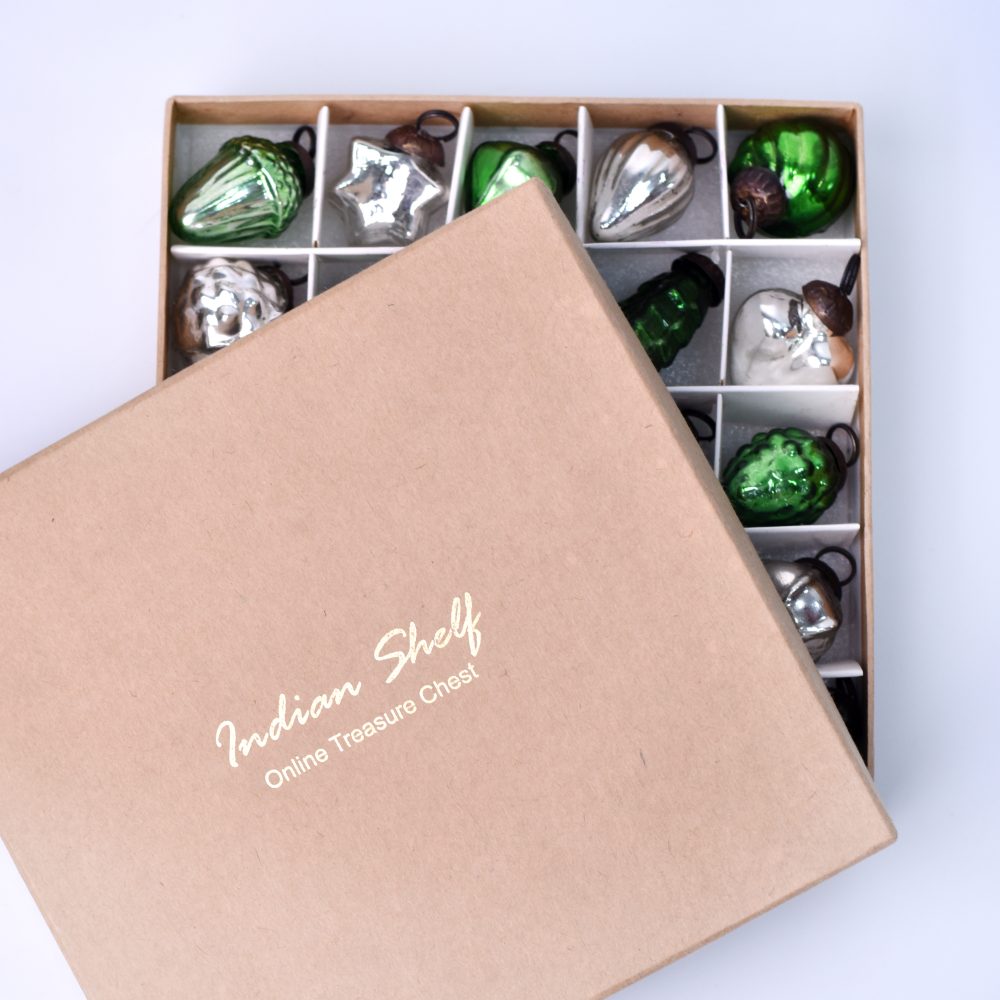 Enhance your holiday and special occasion decor with our exquisite set of 25 glass Christmas ornaments that are skillfully crafted by talented Indian artisans. These ornaments come in a captivating blend of green and silver, offering a stunning and versatile colour scheme that suits various celebrations. Each ornament boasts a unique and enchanting shape, adding a touch of whimsy and elegance to your festive arrangements. These handmade treasures are a testament to the artisan’s craftsmanship and attention to detail, making them a cherished addition to your collection. Hang them on your Christmas tree to infuse a sense of enchantment into your holiday festivities. Grace your wedding ceremony or bridal shower party with their exquisite charm, or adorn your home and garden for a magical ambiance year-round. These ornaments also make for heartfelt gifts, perfect for showing your affection during special occasions or festive celebrations. Share the beauty and craftsmanship of Indian artisans with your loved ones, and let these glass ornaments sparkle in their hearts and homes.
