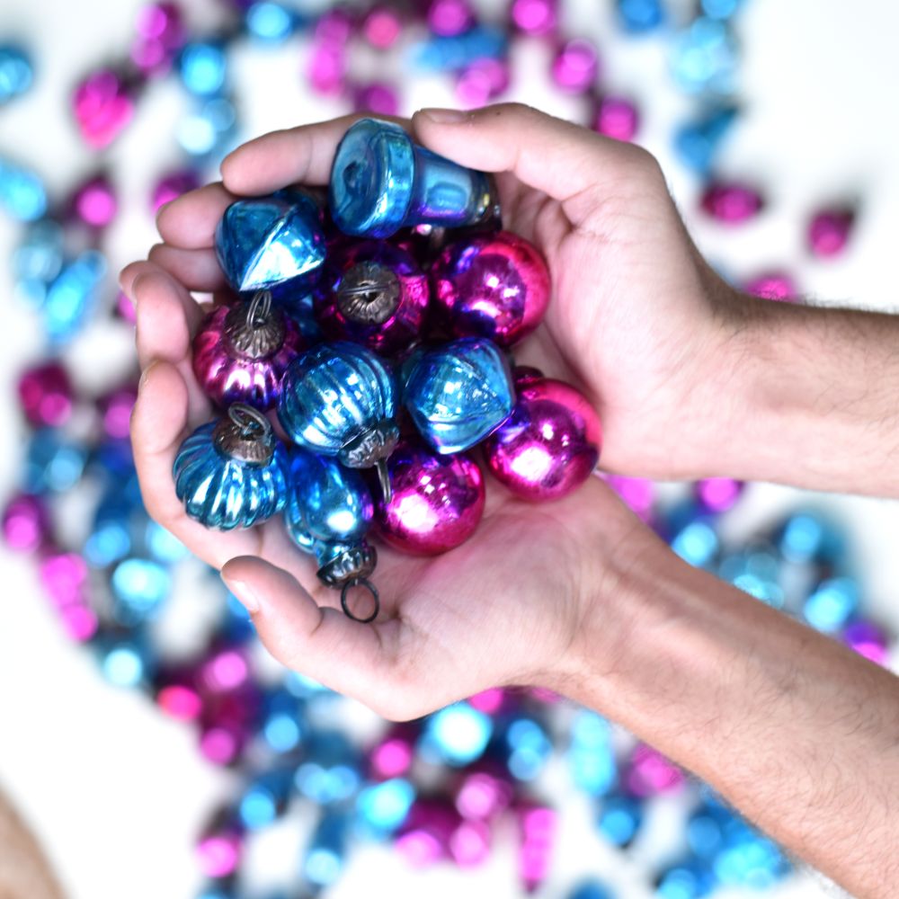 Buy Pink and Turquoise glass Christmas ornaments which are unique and handcrafted masterpiece. Crafted by highly skilled Indian artisans, these ornaments are a celebration of craftsmanship, tradition, and elegance. These stunning ornaments come in a variety of shapes, from classic spheres to intricate designs, ensuring a diverse and captivating display on your Christmas tree. The lush green and gleaming golden colours blend harmoniously, adding a touch of opulence to your holiday decorations. Versatile and enchanting, these ornaments aren't just limited to Christmas. They make a delightful addition to weddings, bridal showers, and other special occasions, elevating the ambiance with their radiant charm. Hang them in your home or garden to infuse every space with a touch of festive cheer. These handcrafted treasures also make for exceptional gifts. Share the joy and craftsmanship with your loved ones on special or festive occasions, leaving a lasting impression of your thoughtfulness and appreciation for beauty..