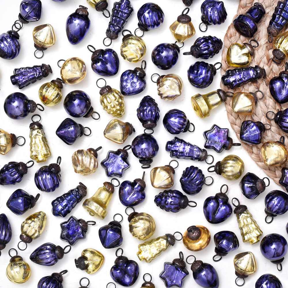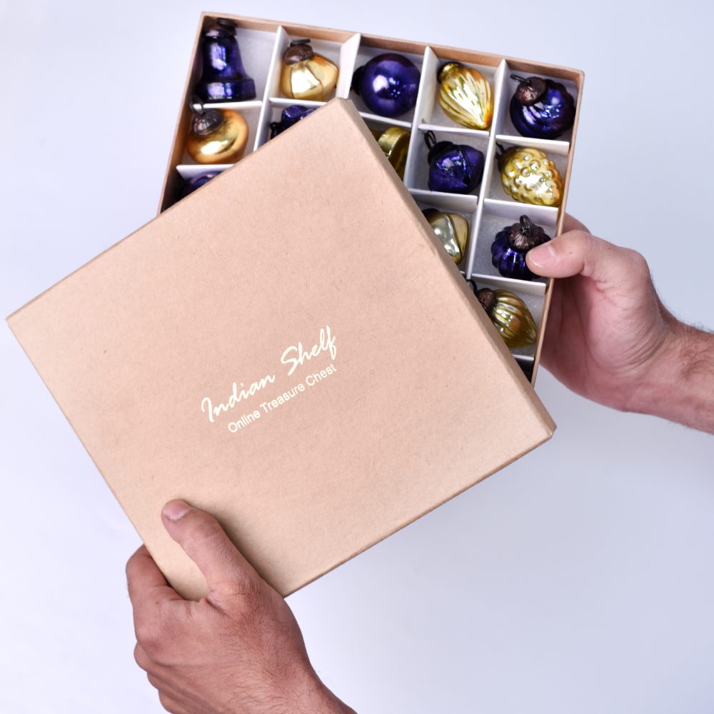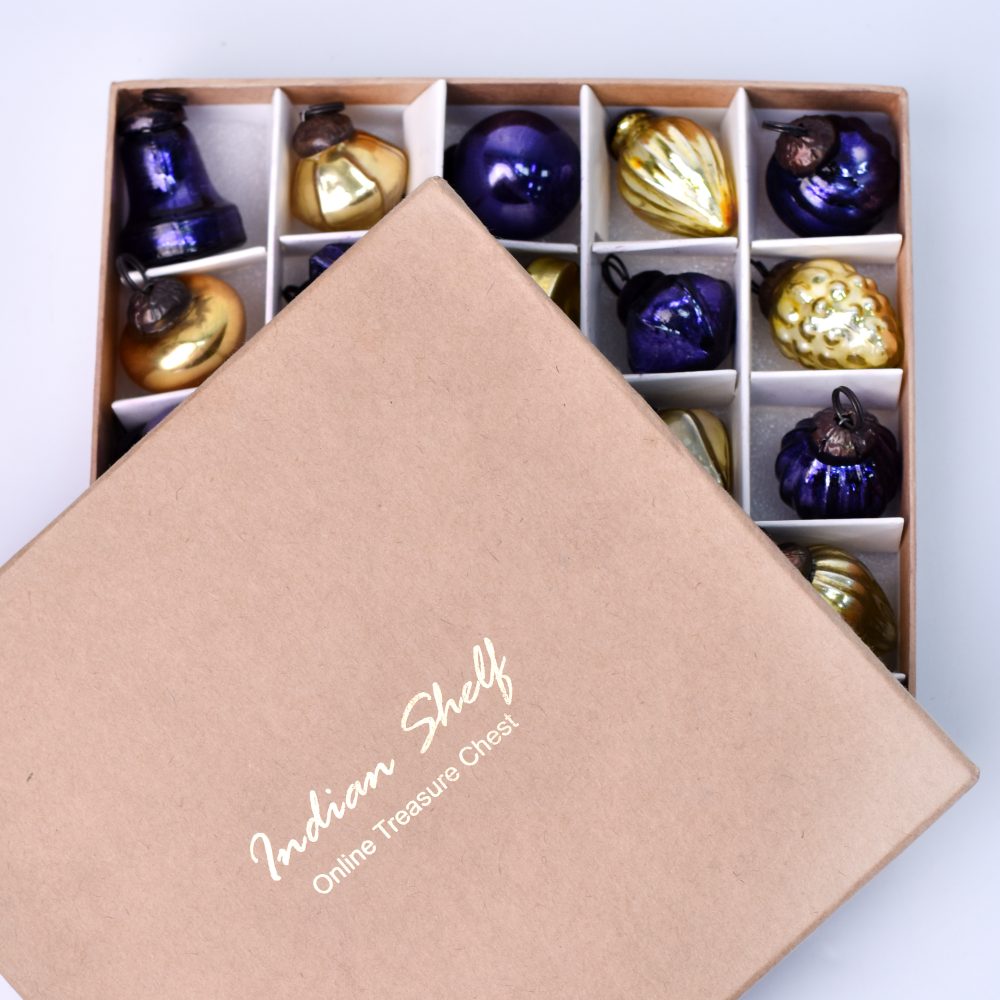 Buy a set of 25 glass Christmas ornaments online that is thoughtfully handcrafted by professional Indian artisans. In a delightful blend of regal purple and shimmering golden hues, these ornaments are sure to add a touch of elegance and charm to any setting. Each ornament in this set boasts a unique and intricate shape, reflecting the meticulous craftsmanship that goes into their creation. These ornaments aren't limited to just Christmas, they are versatile enough to adorn your home, office, hotel, or shop throughout the year, making them a valuable investment in your decor collection. During the festive season, these ornaments will transform your space into a festive wonderland. Hang them on your Christmas tree, drape them from your mantelpiece, or use them to embellish wreaths and garlands. Their timeless beauty will instantly infuse a sense of celebration into any environment. Furthermore, this set makes for an exceptional gift for your loved ones on special occasions or during festive celebrations. Share the artistry of Indian craftsmanship with those dear to you, and let these ornaments become cherished heirlooms in their own right.