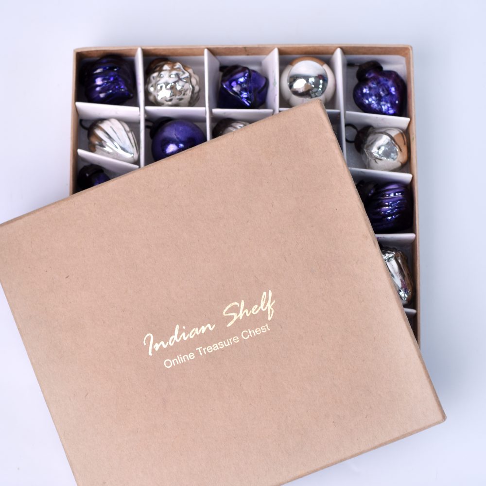 Add a touch of elegance and tradition to your holiday decor with this exquisite set of 25 handmade glass Christmas ornaments. Crafted with care by highly talented Indian artisans, each ornament is a testament to their craftsmanship and attention to detail. The set features a stunning combination of purple and silver hues, adding a regal and festive flair to any setting. These ornaments come in a variety of charming shapes, ensuring a delightful mix for your decorating needs. Whether adorning your home, office, hotel, or shop, these ornaments create a magical atmosphere during Christmas, house decorations, and various festivals. Hang them on your tree, wreaths, garlands, or even use them as table centerpieces for a shimmering holiday display. Not only are these ornaments perfect for your own celebrations, but they also make for thoughtful gifts on special occasions or during the festive season.