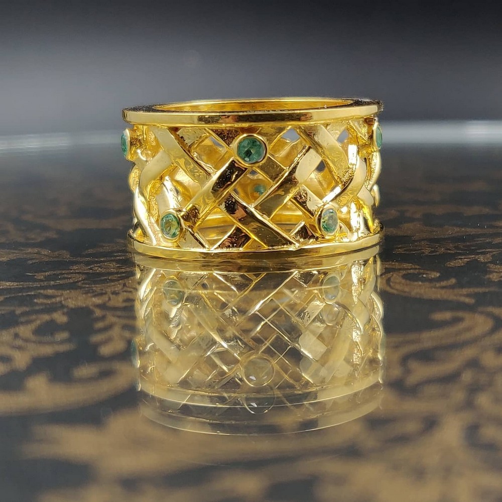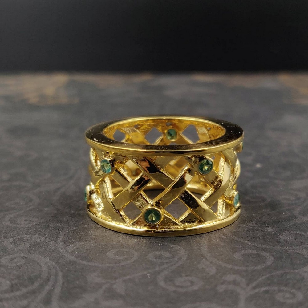 Bold, regal, and meticulously handcraftedthis 3micron gold plated green onyx band ring is a statement piece designed for women who appreciate intricate artistry. The wide lattice band features a woven metal pattern adorned with polished green onyx stones, creating a luxurious fusion of heritage design and contemporary elegance.