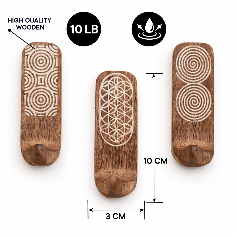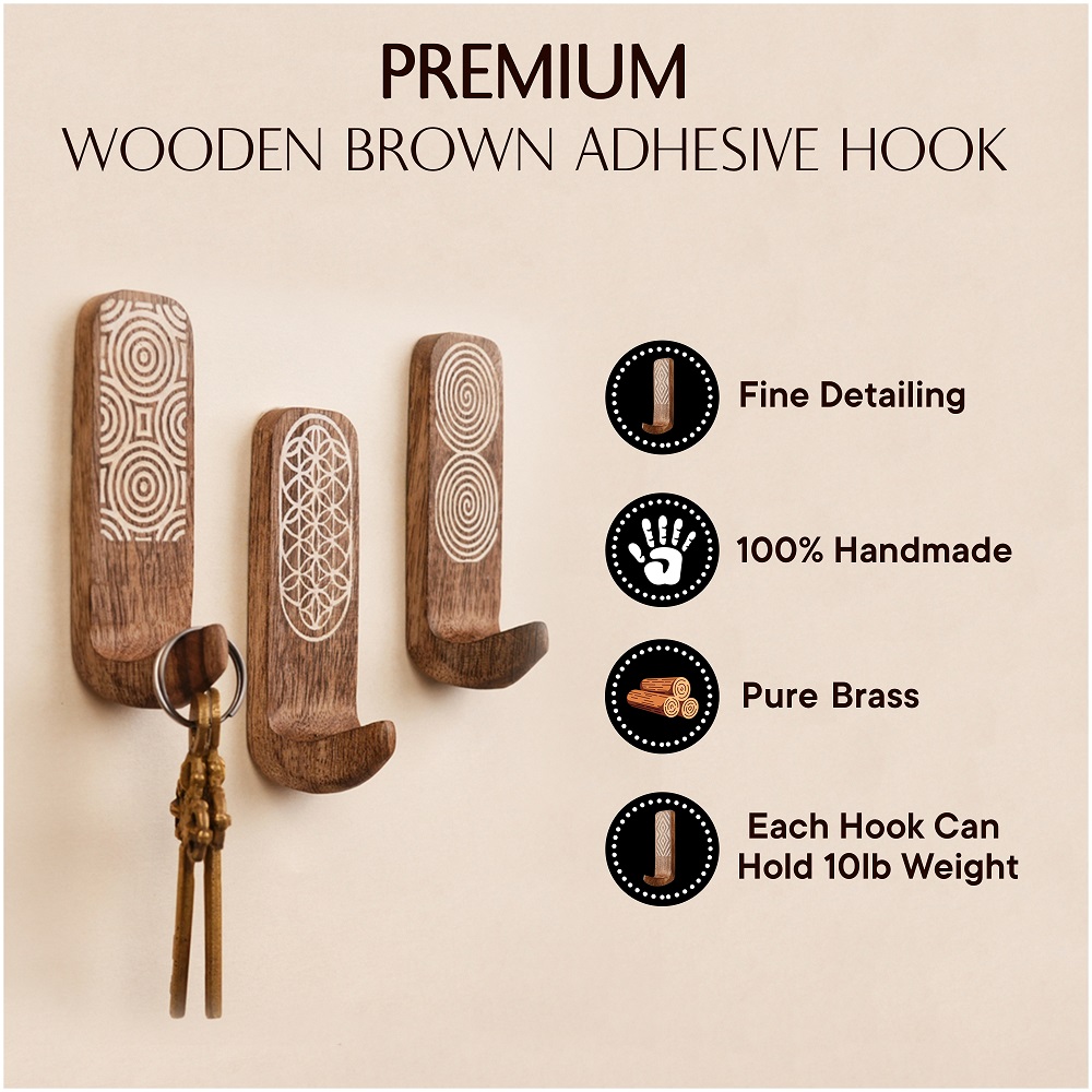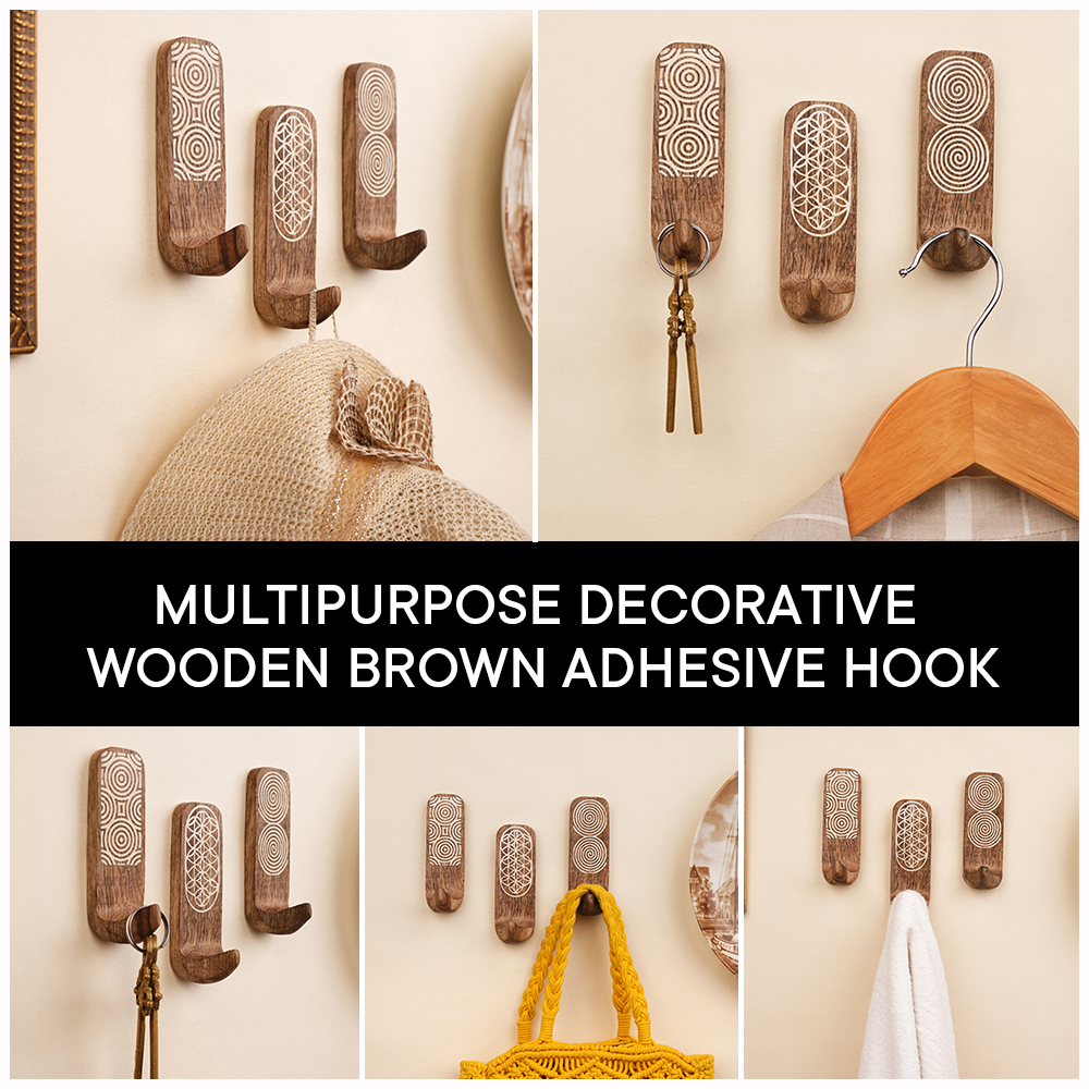 Upgrade your wall organization with this Designer Wooden Adhesive Wall Hook, crafted from premium natural wood and detailed with elegant geometric carvings. Featuring unique circular, spiral, and floral-inspired patterns, this hook adds a stylish decorative accent while offering practical storage for everyday essentials. The strong self-adhesive backing ensures quick, drill-free installationsimply peel and stick onto smooth surfaces like tiles, glass, metal, or finished wood. Its compact yet sturdy design makes it suitable for hanging towels, keys, clothes, scarves, caps, or lightweight bags. Perfect for bathrooms, bedrooms, entryways, kitchens, and offices, this wooden wall hook blends durability with aesthetic charm, keeping your space organized and visually appealing.