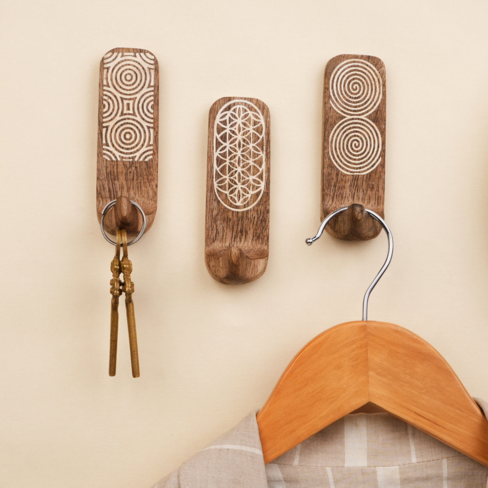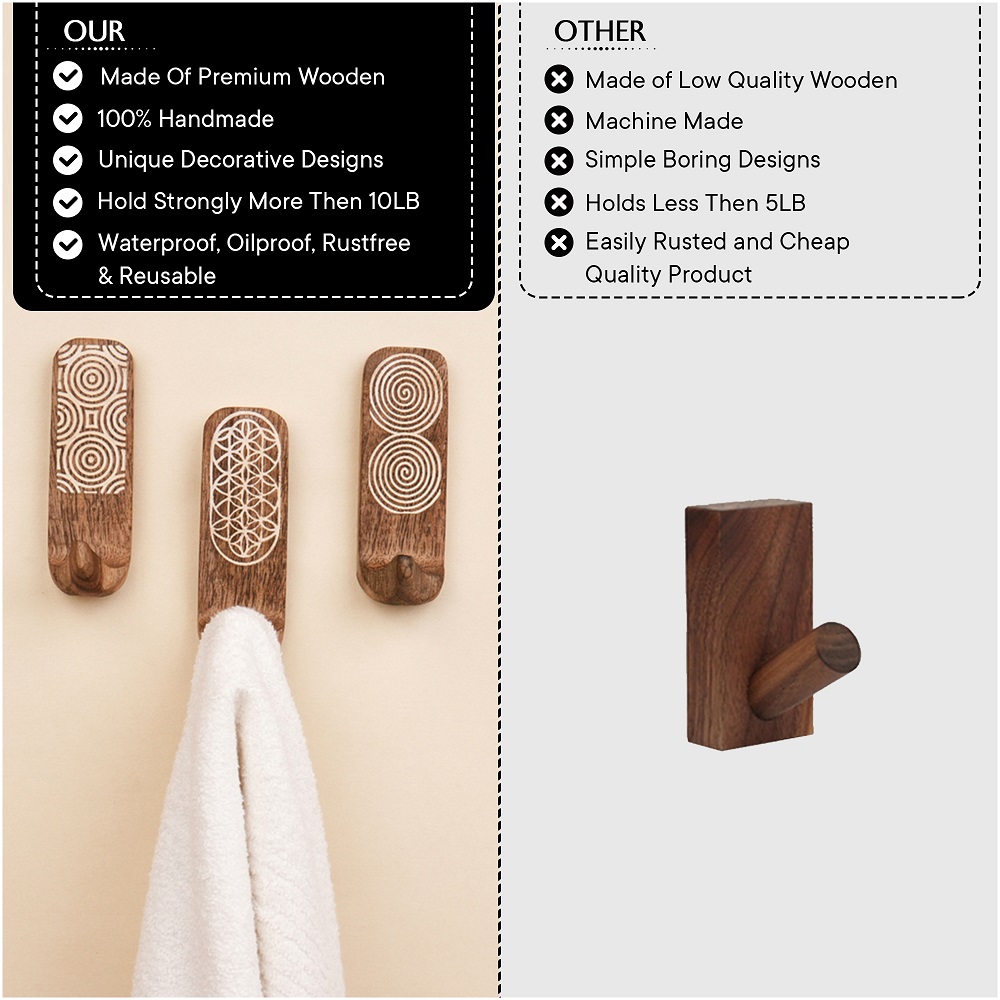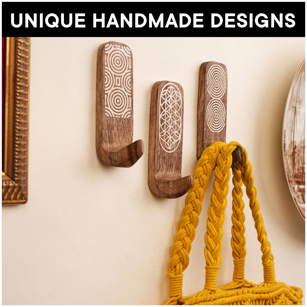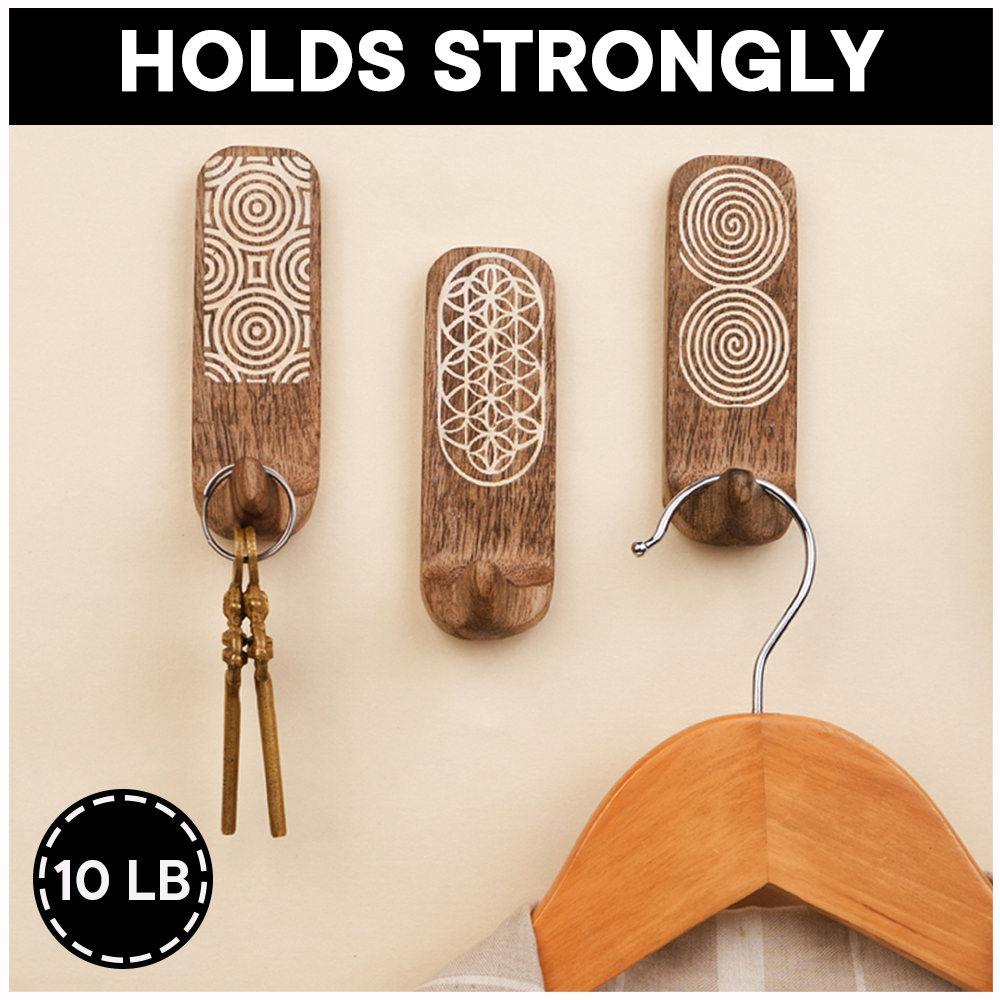 Upgrade your wall organization with this Designer Wooden Adhesive Wall Hook, crafted from premium natural wood and detailed with elegant geometric carvings. Featuring unique circular, spiral, and floral-inspired patterns, this hook adds a stylish decorative accent while offering practical storage for everyday essentials. The strong self-adhesive backing ensures quick, drill-free installationsimply peel and stick onto smooth surfaces like tiles, glass, metal, or finished wood. Its compact yet sturdy design makes it suitable for hanging towels, keys, clothes, scarves, caps, or lightweight bags. Perfect for bathrooms, bedrooms, entryways, kitchens, and offices, this wooden wall hook blends durability with aesthetic charm, keeping your space organized and visually appealing.