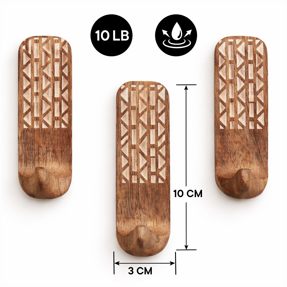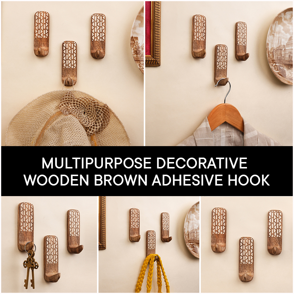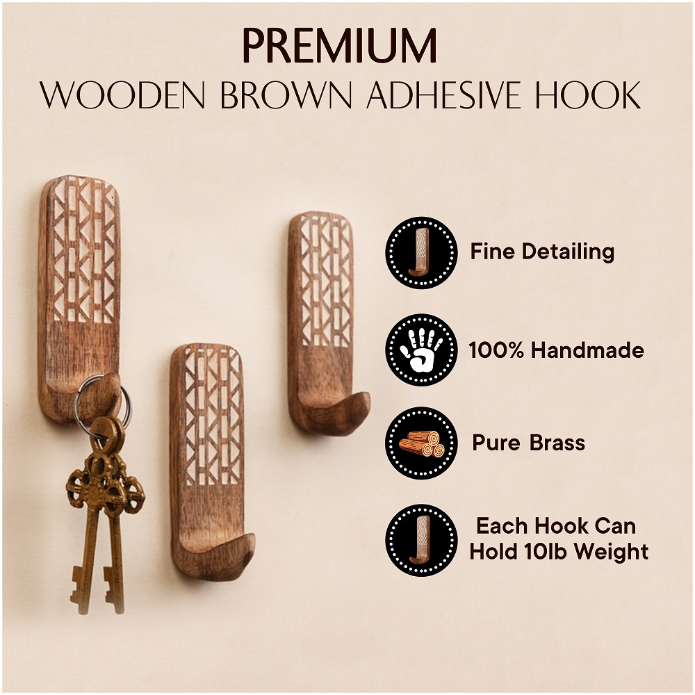 Buy a brown wooden wall hook that are adorned with a tasteful white colour pattern meticulously engraved by highly skilled Indian artisans. Handcrafted with precision from high-quality wood, these hooks seamlessly blend functionality with aesthetics, making them an ideal addition to any space. These hooks are more than just decorative pieces; they serve a practical purpose as versatile organizers. The set comes with heavy-duty adhesive hooks, ensuring easy and secure installation without the need for drills or tools. The self-adhesive hooks offer a hassle-free experience, allowing you to transform your living space effortlessly. Designed with practicality in mind, these adhesive towel hooks are perfect for hanging towels, clothes, hats, bags, keys, scarves, and jackets. Their sturdy construction ensures durability, making them reliable companions for your daily organizational needs. Elevate your home decor while maintaining a tidy living space with these functional yet stylish wall hooks. What sets these hooks apart is not just their utility but also their thoughtful craftsmanship, making them an ideal gift for your loved ones on special or festive occasions. Give the gift of organization and aesthetics with these handmade wall hooks, bringing a touch of artisanal charm to any home.