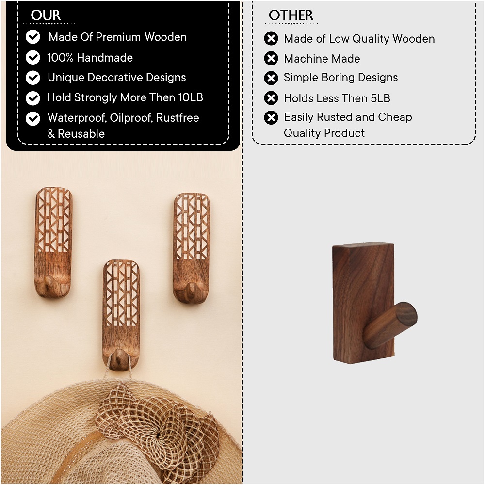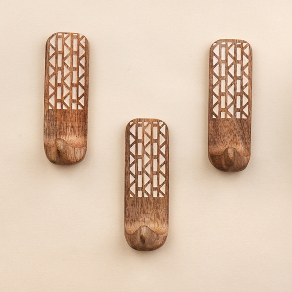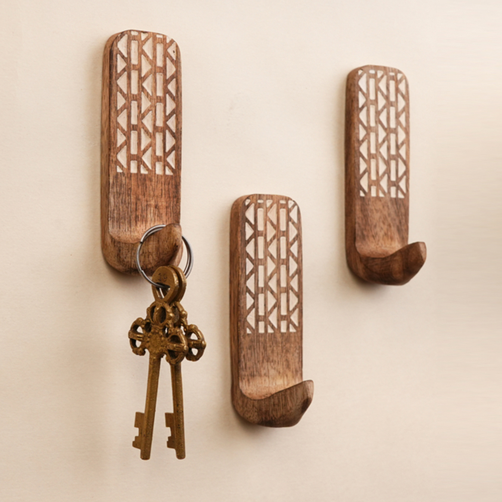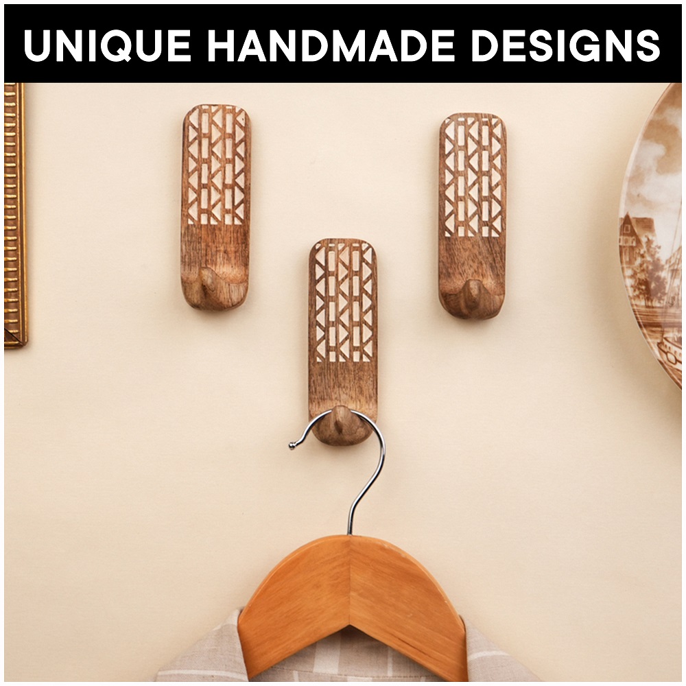Buy a brown wooden wall hook that are adorned with a tasteful white colour pattern meticulously engraved by highly skilled Indian artisans. Handcrafted with precision from high-quality wood, these hooks seamlessly blend functionality with aesthetics, making them an ideal addition to any space. These hooks are more than just decorative pieces; they serve a practical purpose as versatile organizers. The set comes with heavy-duty adhesive hooks, ensuring easy and secure installation without the need for drills or tools. The self-adhesive hooks offer a hassle-free experience, allowing you to transform your living space effortlessly. Designed with practicality in mind, these adhesive towel hooks are perfect for hanging towels, clothes, hats, bags, keys, scarves, and jackets. Their sturdy construction ensures durability, making them reliable companions for your daily organizational needs. Elevate your home decor while maintaining a tidy living space with these functional yet stylish wall hooks. What sets these hooks apart is not just their utility but also their thoughtful craftsmanship, making them an ideal gift for your loved ones on special or festive occasions. Give the gift of organization and aesthetics with these handmade wall hooks, bringing a touch of artisanal charm to any home.