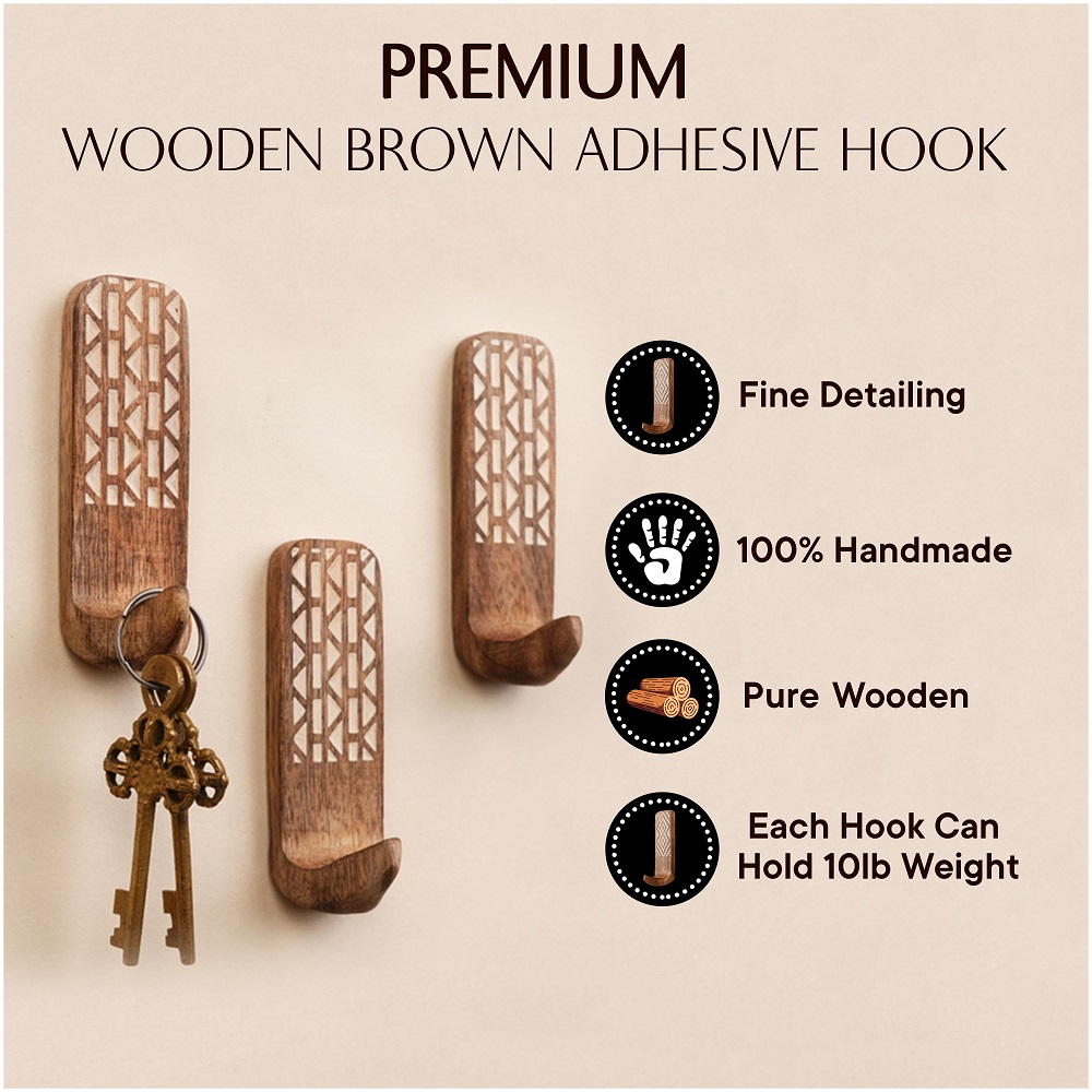 Buy a brown wooden wall hook that are adorned with a tasteful white colour pattern meticulously engraved by highly skilled Indian artisans. Handcrafted with precision from high-quality wood, these hooks seamlessly blend functionality with aesthetics, making them an ideal addition to any space. These hooks are more than just decorative pieces; they serve a practical purpose as versatile organizers. The set comes with heavy-duty adhesive hooks, ensuring easy and secure installation without the need for drills or tools. The self-adhesive hooks offer a hassle-free experience, allowing you to transform your living space effortlessly. Designed with practicality in mind, these adhesive towel hooks are perfect for hanging towels, clothes, hats, bags, keys, scarves, and jackets. Their sturdy construction ensures durability, making them reliable companions for your daily organizational needs. Elevate your home decor while maintaining a tidy living space with these functional yet stylish wall hooks. What sets these hooks apart is not just their utility but also their thoughtful craftsmanship, making them an ideal gift for your loved ones on special or festive occasions. Give the gift of organization and aesthetics with these handmade wall hooks, bringing a touch of artisanal charm to any home.