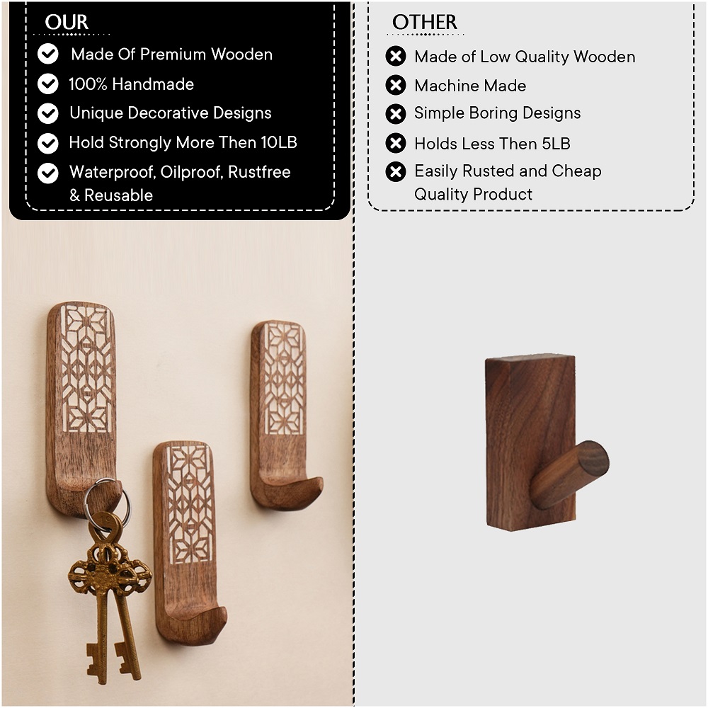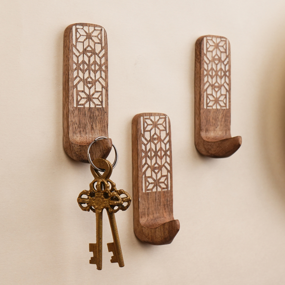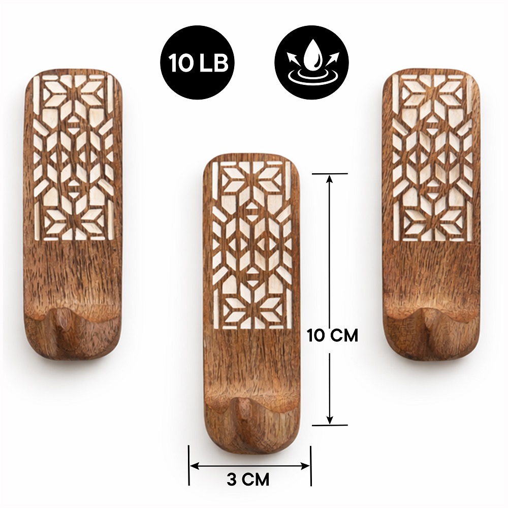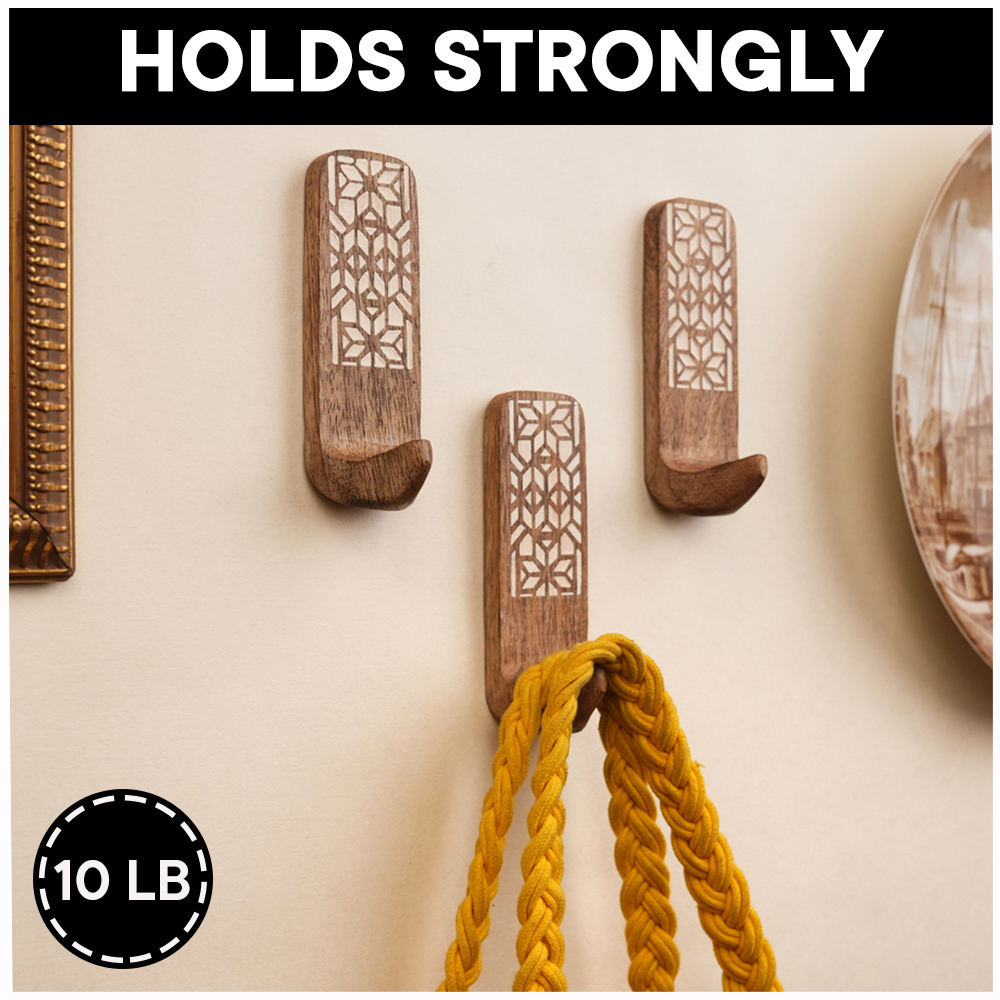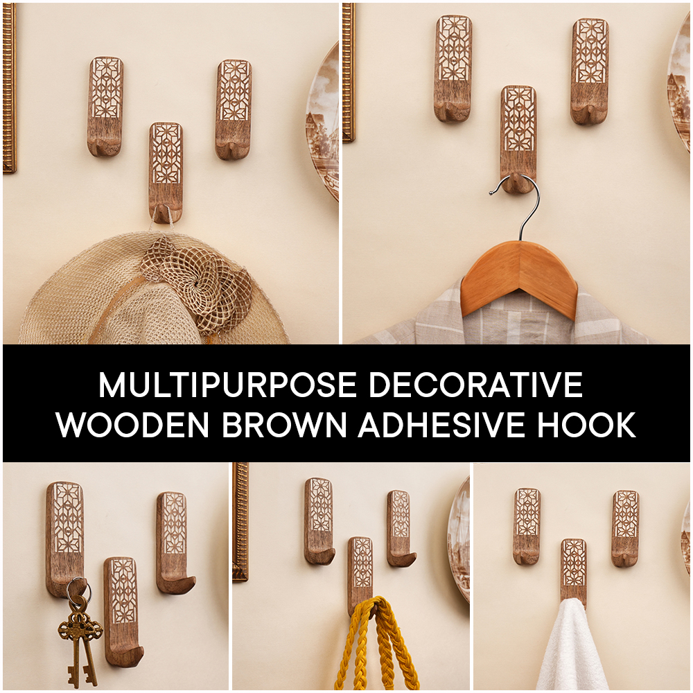 Buy a brown wooden wall hook that are adorned with a tasteful white colour pattern meticulously engraved by highly skilled Indian artisans. Handcrafted with precision from high-quality wood, these hooks seamlessly blend functionality with aesthetics, making them an ideal addition to any space. These hooks are more than just decorative pieces; they serve a practical purpose as versatile organizers. The set comes with heavy-duty adhesive hooks, ensuring easy and secure installation without the need for drills or tools. The self-adhesive hooks offer a hassle-free experience, allowing you to transform your living space effortlessly. Designed with practicality in mind, these adhesive towel hooks are perfect for hanging towels, clothes, hats, bags, keys, scarves, and jackets. Their sturdy construction ensures durability, making them reliable companions for your daily organizational needs. Elevate your home decor while maintaining a tidy living space with these functional yet stylish wall hooks. What sets these hooks apart is not just their utility but also their thoughtful craftsmanship, making them an ideal gift for your loved ones on special or festive occasions. Give the gift of organization and aesthetics with these handmade wall hooks, bringing a touch of artisanal charm to any home.