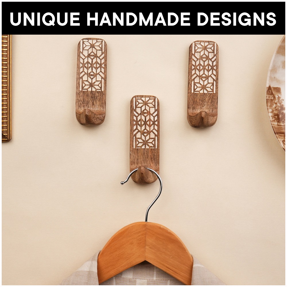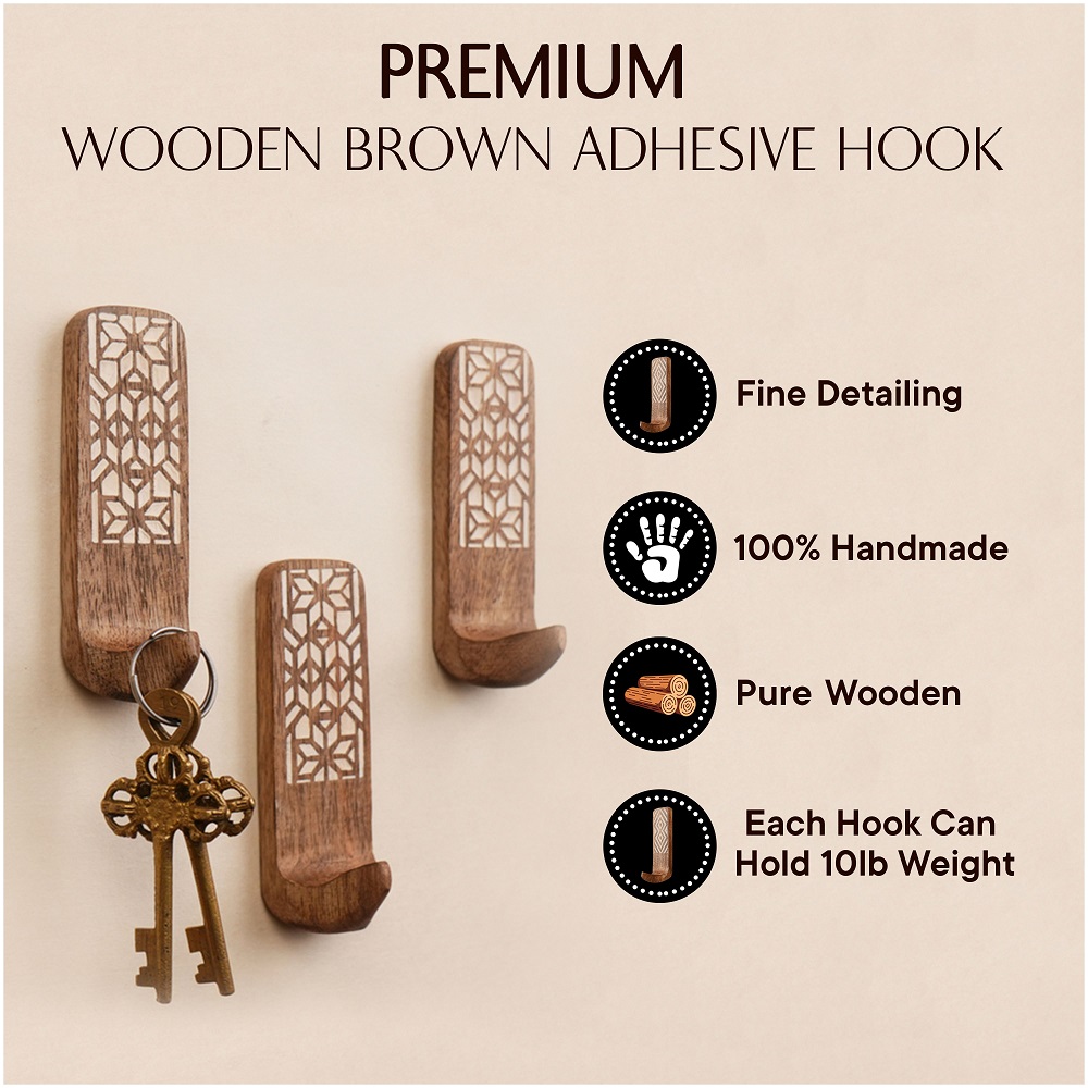 Buy a brown wooden wall hook that are adorned with a tasteful white colour pattern meticulously engraved by highly skilled Indian artisans. Handcrafted with precision from high-quality wood, these hooks seamlessly blend functionality with aesthetics, making them an ideal addition to any space. These hooks are more than just decorative pieces; they serve a practical purpose as versatile organizers. The set comes with heavy-duty adhesive hooks, ensuring easy and secure installation without the need for drills or tools. The self-adhesive hooks offer a hassle-free experience, allowing you to transform your living space effortlessly. Designed with practicality in mind, these adhesive towel hooks are perfect for hanging towels, clothes, hats, bags, keys, scarves, and jackets. Their sturdy construction ensures durability, making them reliable companions for your daily organizational needs. Elevate your home decor while maintaining a tidy living space with these functional yet stylish wall hooks. What sets these hooks apart is not just their utility but also their thoughtful craftsmanship, making them an ideal gift for your loved ones on special or festive occasions. Give the gift of organization and aesthetics with these handmade wall hooks, bringing a touch of artisanal charm to any home.
