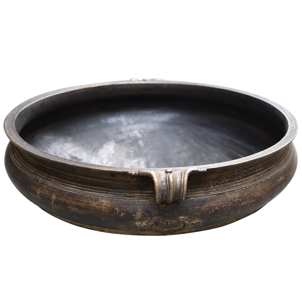 Bronze urli indian style with handle having beautiful ornamentation. Ideal to put flowers and floating candles and use it as a perfect indoor/outdoor decoration. It is completly done by hand. It serves as a beautiful bronze bird bath too.