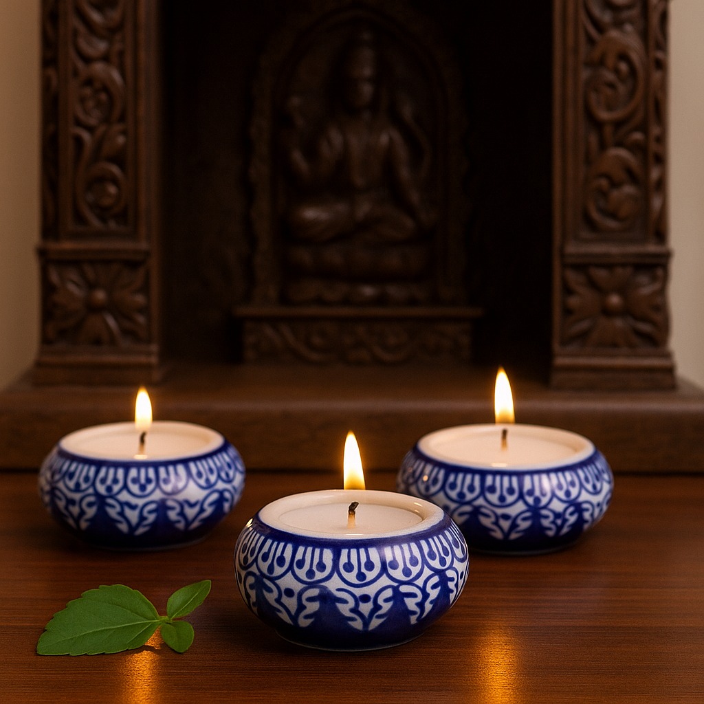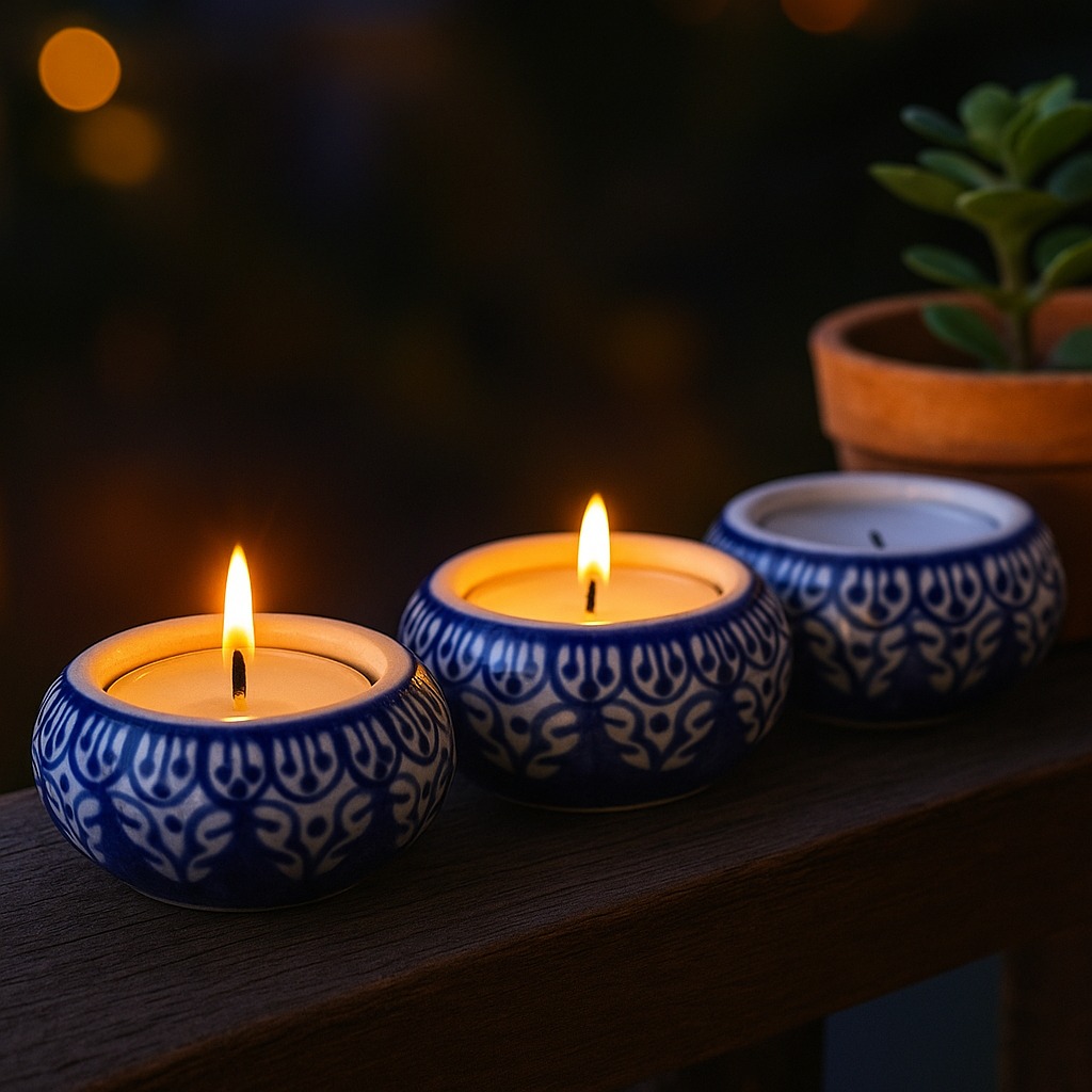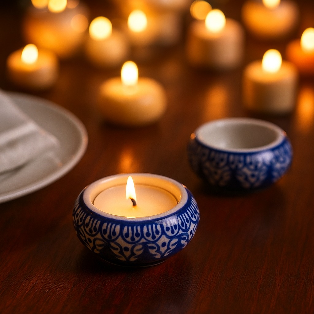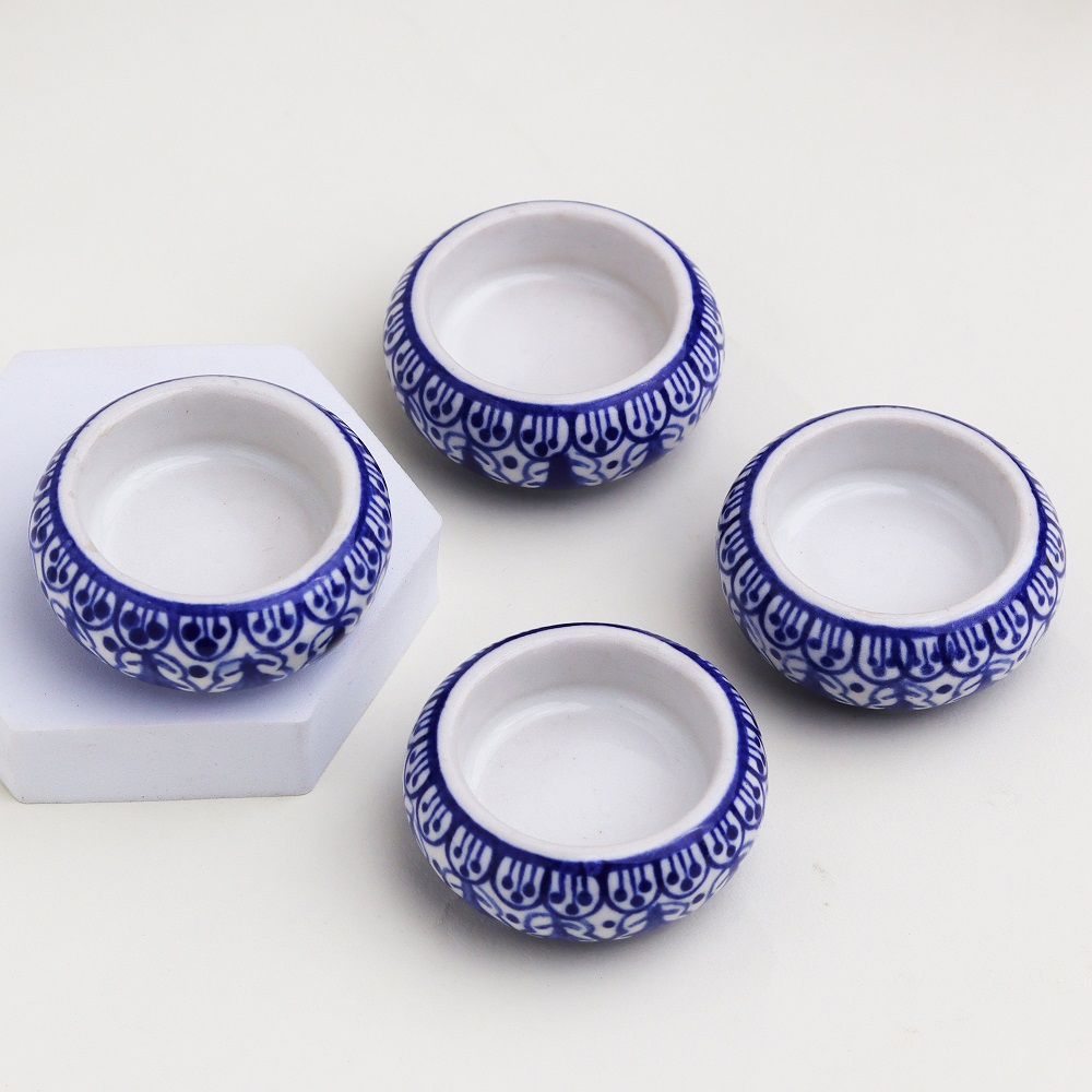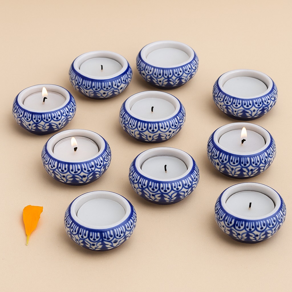 Buy a ceramic tea light holder online that is a harmonious fusion of high-quality craftsmanship and cultural artistry. Handmade by skilled Indian artisans, each piece reflects their dedication to their craft. This captivating tea light holder boasts a captivating blend of white and blue hues, reminiscent of tranquil seas and serene skies. Tea light holders have long symbolized warmth and togetherness. As the gentle flicker of the candle dances within the ceramic enclosure, it casts enchanting shadows that create an inviting atmosphere. Perfect for any setting, whether it's your cherished home, a cosy cafe, an elegant restaurant, a charming shop, or a luxurious hotel. Bring charm to your space and create unforgettable moments on special occasions with your loved ones. Illuminate dinners, celebrations, or intimate conversations with the soothing radiance of our tea light holder. It's not just a decoration; it's an experience that ignites feelings of comfort and connection. Looking for an exceptional gift? This handcrafted ceramic tea light holder is an ideal present for your loved ones on special, festive, or auspicious occasions. Share the joy of artisanal craftsmanship and the magic of soft candlelight with those who matter most.
