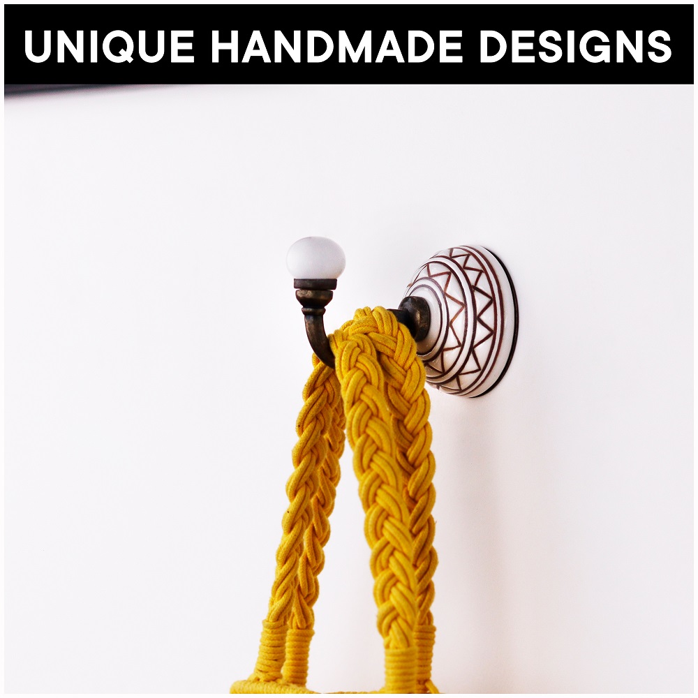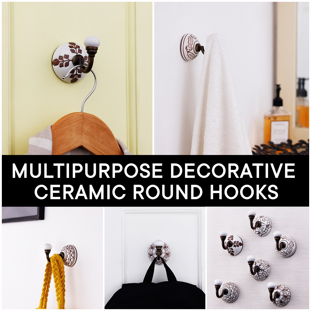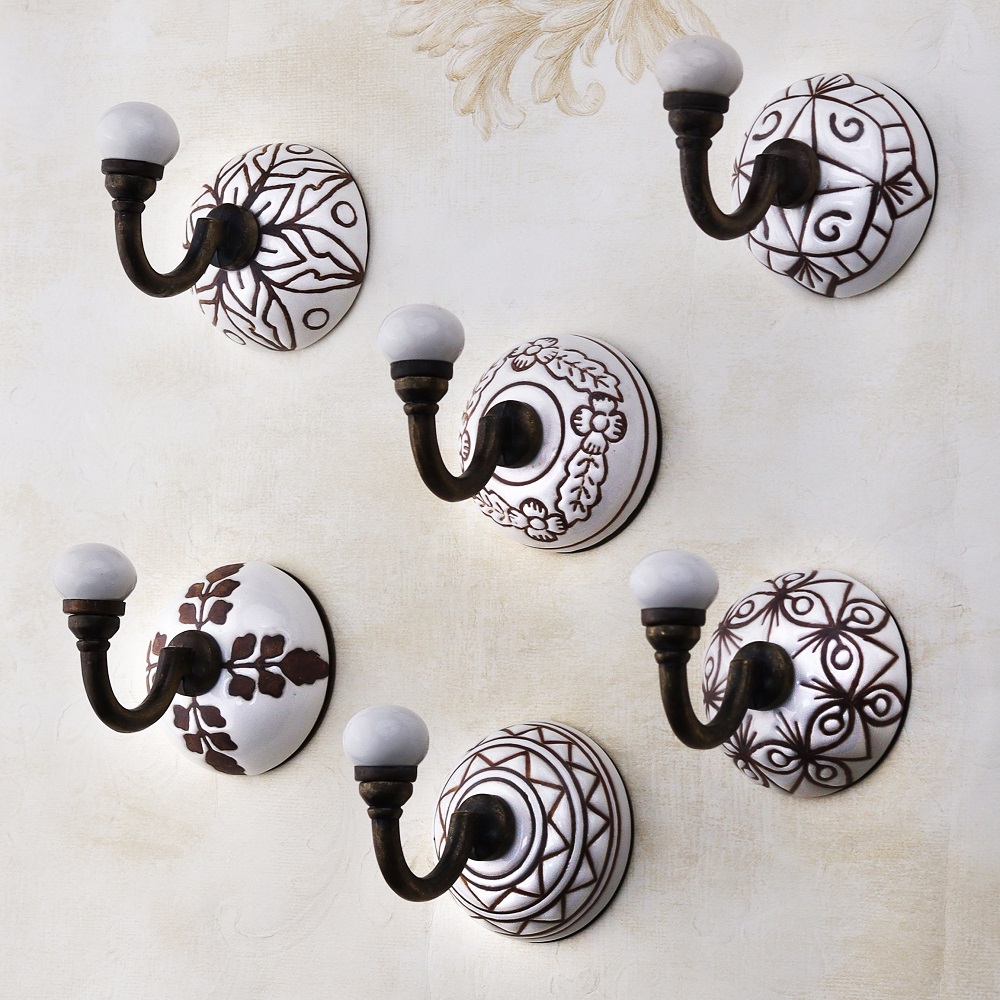 6 Pieces Brown Pattern Etched Ceramic Wall Hooks. When Put on Wall or Cabinet It is An Art in Itself. This Hook is Strong Enough to Hold Your Cloths, Keys, Tea Cups, Coffee Mugs, Hand Towels etc.