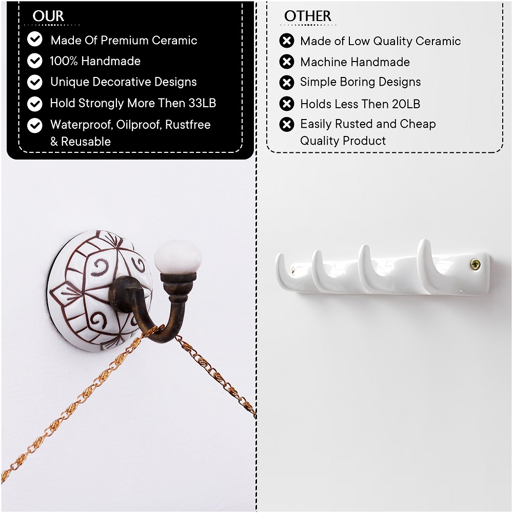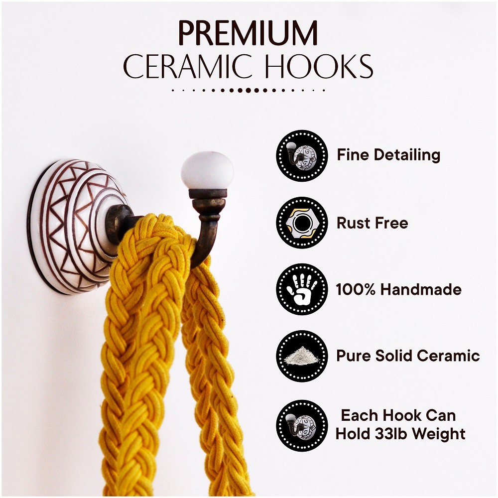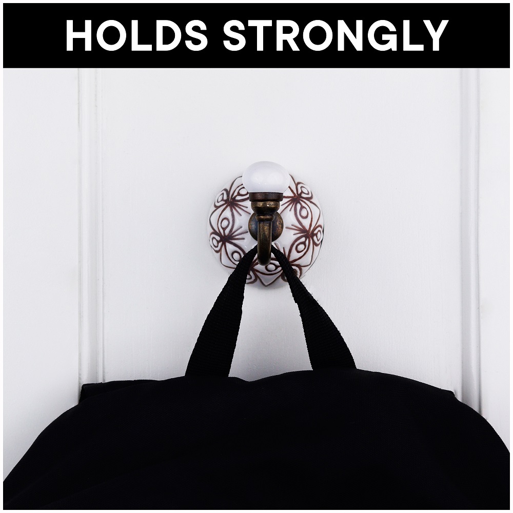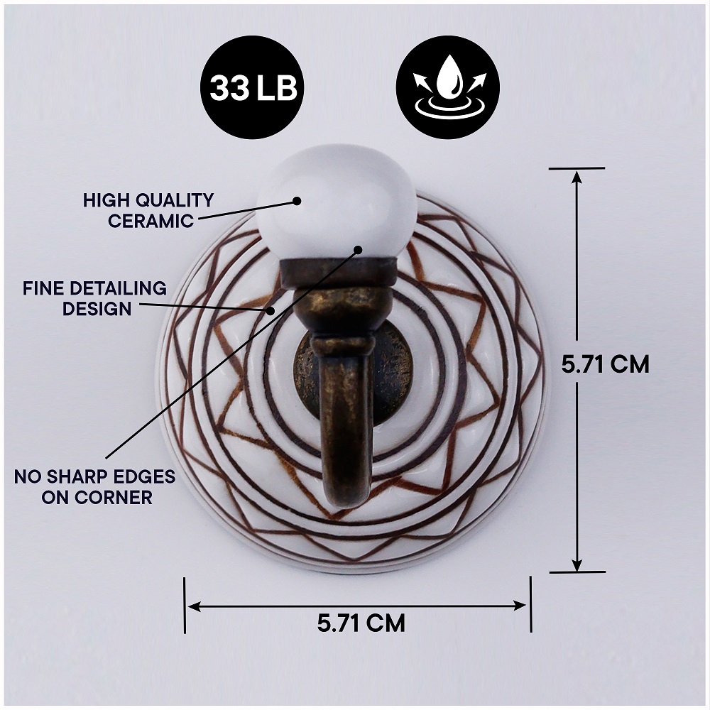 6 Pieces Brown Pattern Etched Ceramic Wall Hooks. When Put on Wall or Cabinet It is An Art in Itself. This Hook is Strong Enough to Hold Your Cloths, Keys, Tea Cups, Coffee Mugs, Hand Towels etc.