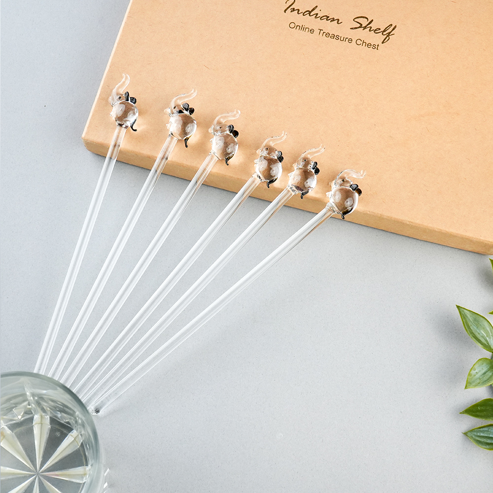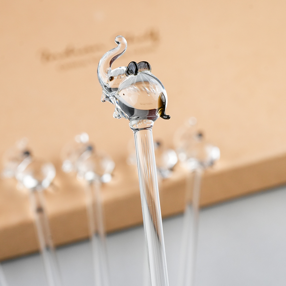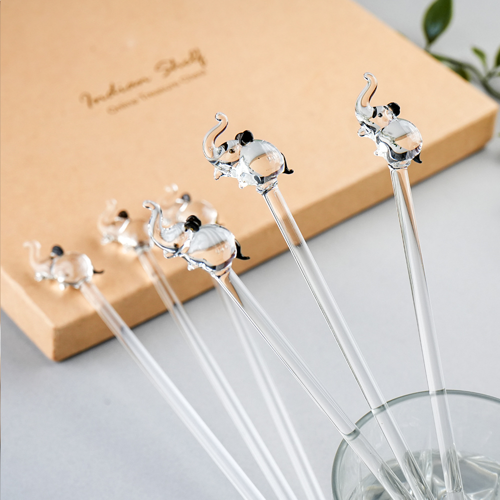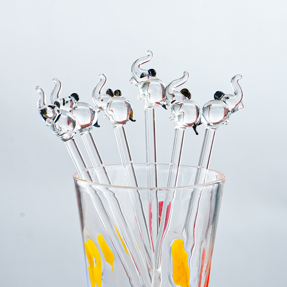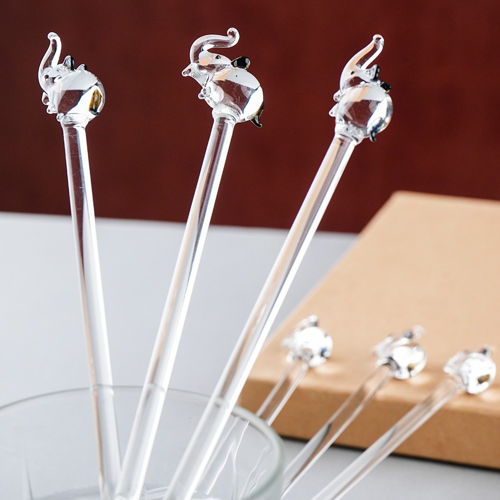 Elevate your drink presentation with this exquisite set of handcrafted glass stirrers featuring delicate Clear Black Elephant designs on top. Each stirrer is carefully made with clear glass stems and intricately shaped Fish figures, adding a playful yet elegant touch to your beverages. Perfect for cocktails, mocktails, tea, or coffee, these stirrers combine functionality with artistic charm. Ideal for home use, parties, or gifting, they bring a unique and stylish flair to any table setting.