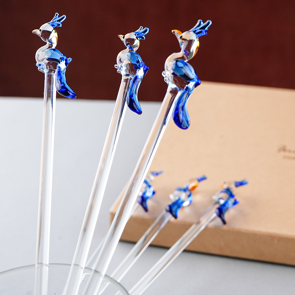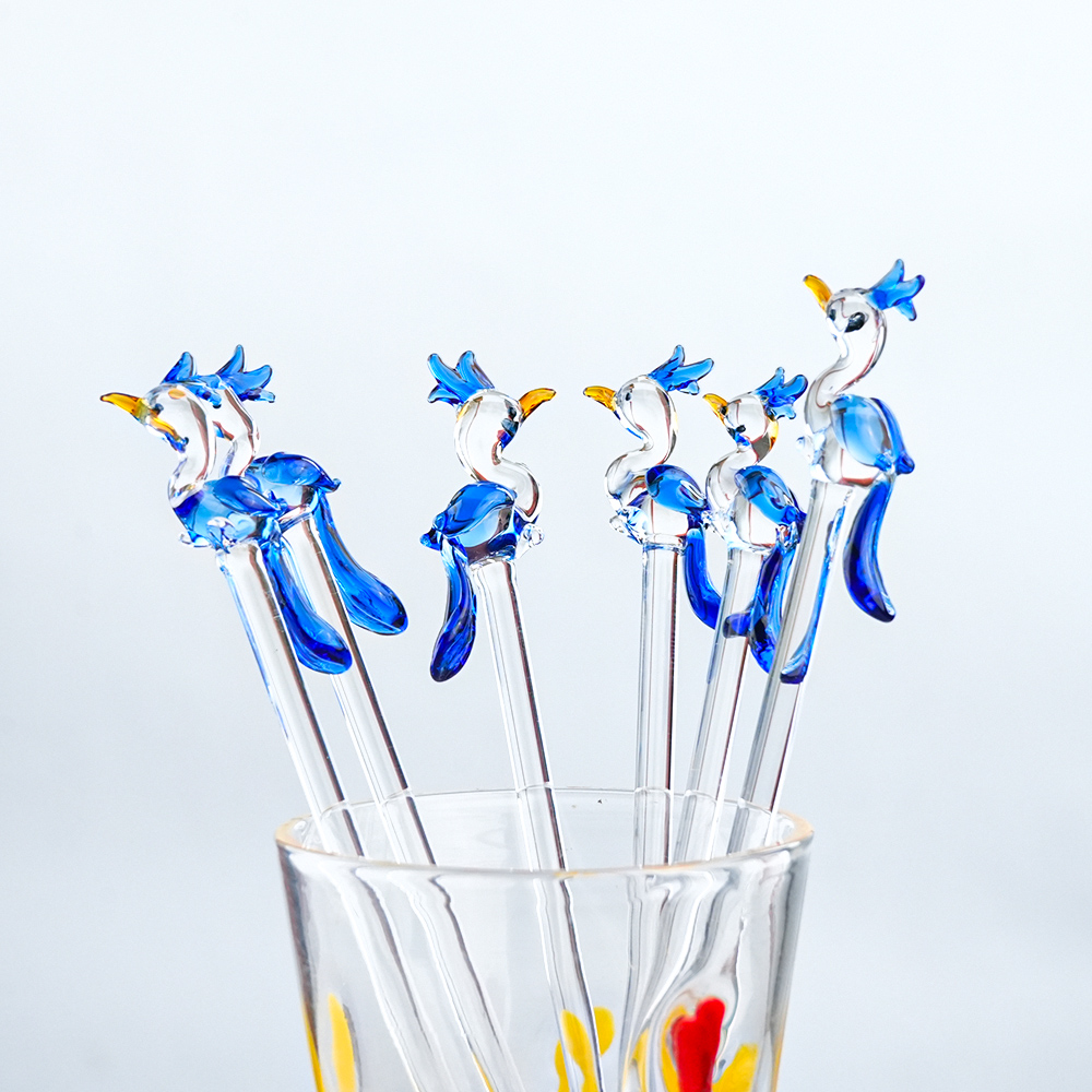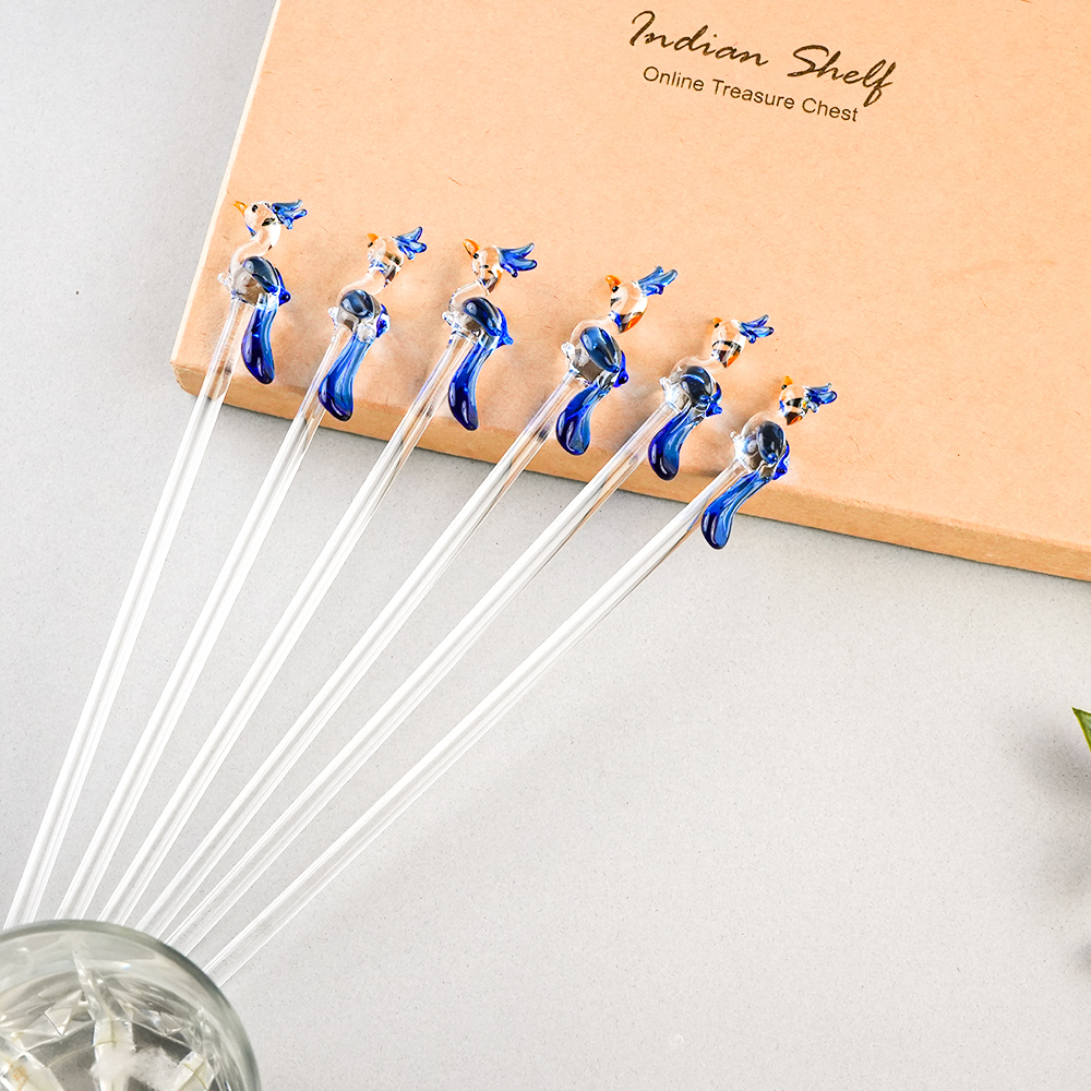 Elevate your drink presentation with this exquisite set of handcrafted glass stirrers featuring delicate Clear Blue Peacock designs on top. Each stirrer is carefully made with clear glass stems and intricately shaped peacock figures, adding a playful yet elegant touch to your beverages. Perfect for cocktails, mocktails, tea, or coffee, these stirrers combine functionality with artistic charm. Ideal for home use, parties, or gifting, they bring a unique and stylish flair to any table setting.