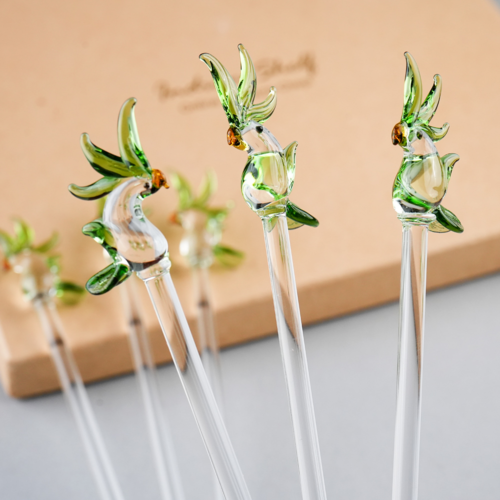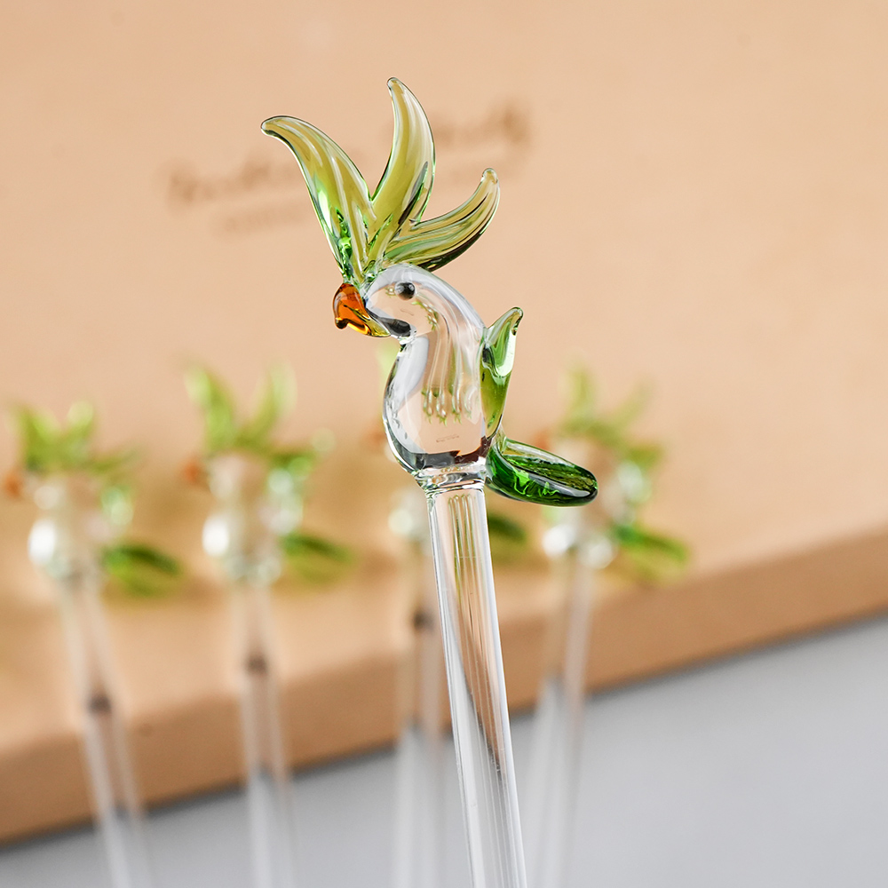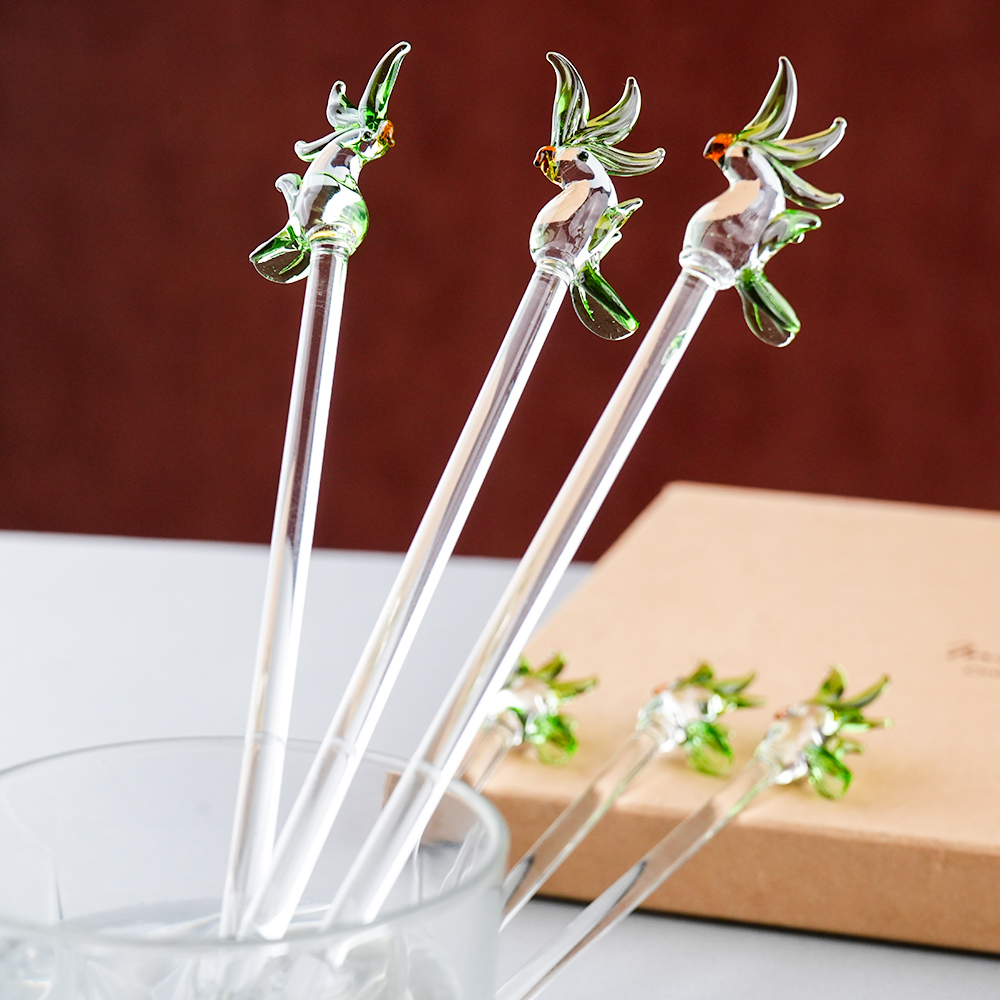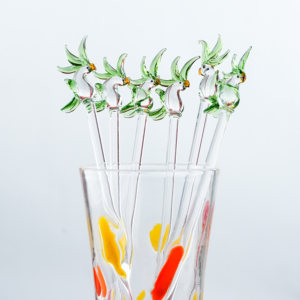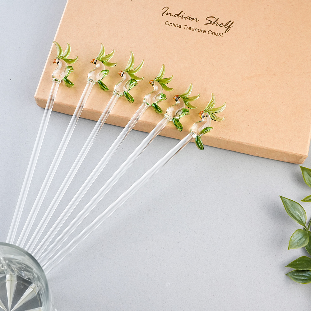 Elevate your drink presentation with this exquisite set of handcrafted glass stirrers featuring delicate Clear Green Parrot designs on top. Each stirrer is carefully made with clear glass stems and intricately shaped Parrot figures, adding a playful yet elegant touch to your beverages. Perfect for cocktails, mocktails, tea, or coffee, these stirrers combine functionality with artistic charm. Ideal for home use, parties, or gifting, they bring a unique and stylish flair to any table setting.