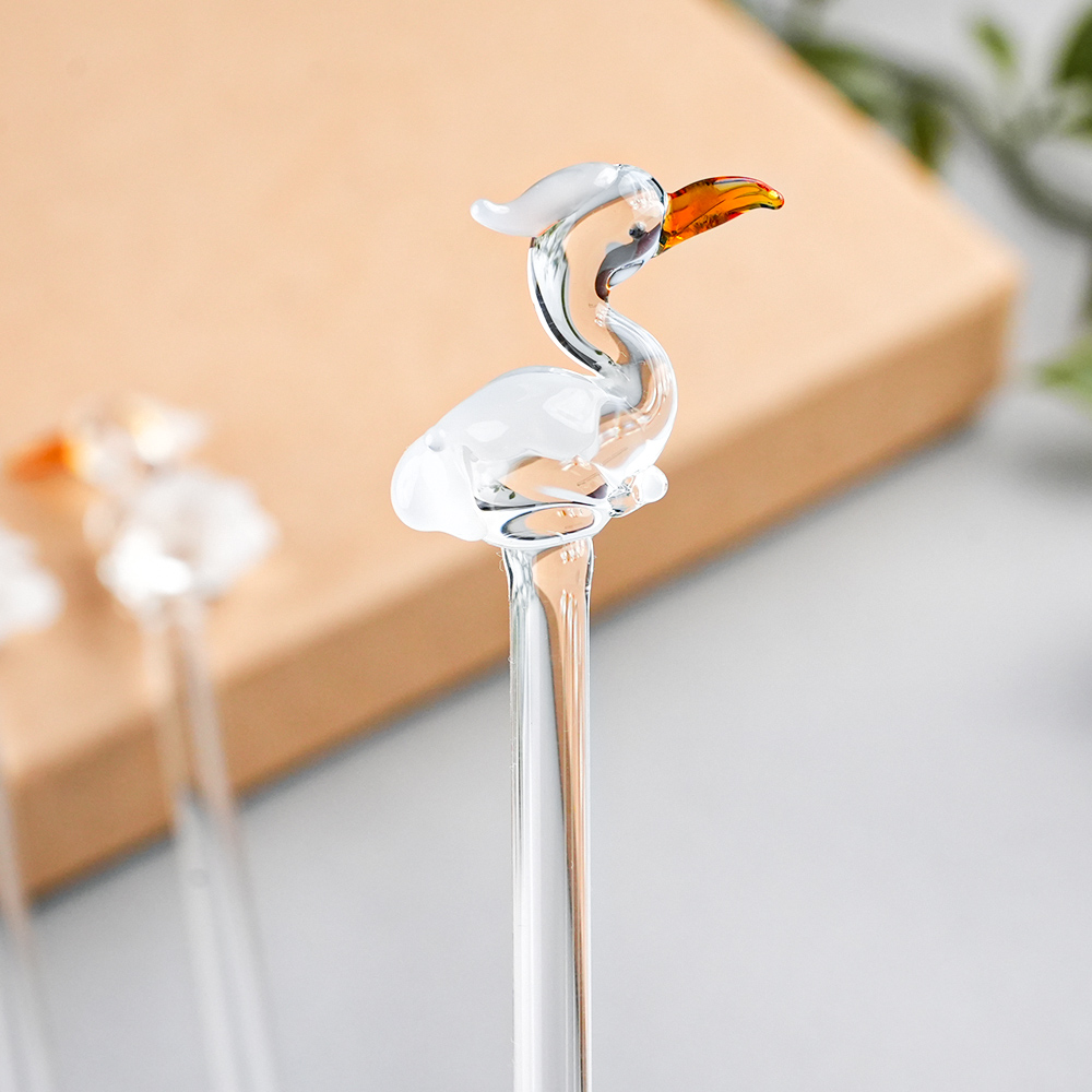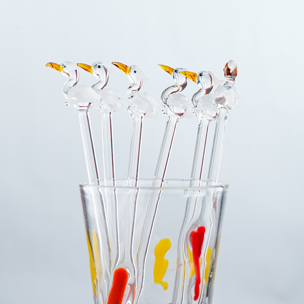 Elevate your drink presentation with this exquisite set of handcrafted glass stirrers featuring delicate Clear Pelican Bird designs on top. Each stirrer is carefully made with clear glass stems and intricately shaped Pelican Bird figures, adding a playful yet elegant touch to your beverages. Perfect for cocktails, mocktails, tea, or coffee, these stirrers combine functionality with artistic charm. Ideal for home use, parties, or gifting, they bring a unique and stylish flair to any table setting.