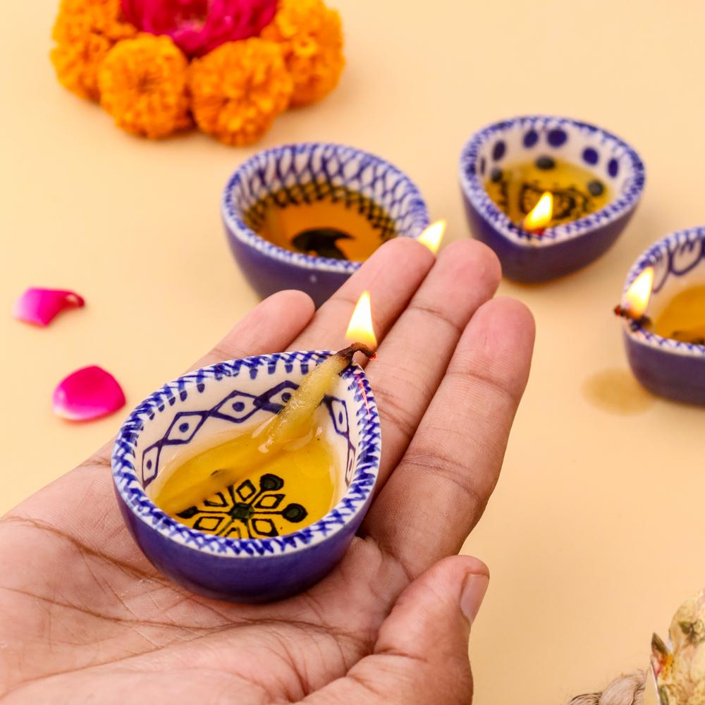 Add elegance and devotion to your mandir with this designer blue and white ceramic Diwali diya, thoughtfully handcrafted by skilled artisans. Each diya features unique hand-painted motifs in indigo blue against a white ceramic base, creating a stunning visual appeal. Compact yet radiant, these diyas are perfect for temple decoration, daily puja rituals, and festive occasions. Their blend of artistry and spirituality makes them a timeless addition to any sacred setting.