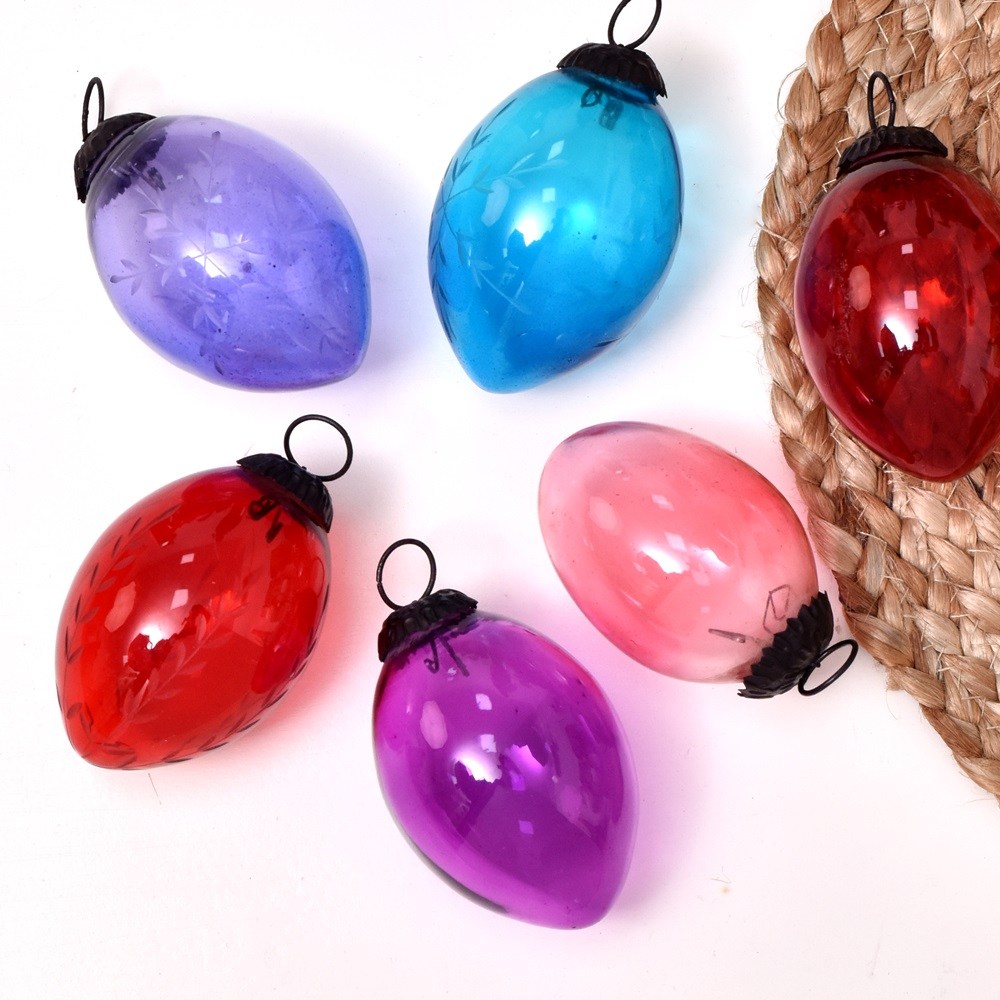 Buy Multicolor glass Christmas ornaments which are unique and handcrafted masterpiece. Crafted by highly skilled Indian artisans, these ornaments are a celebration of craftsmanship, tradition, and elegance. These stunning ornaments come in a variety of shapes, from classic spheres to intricate designs, ensuring a diverse and captivating display on your Christmas tree. The lush multi- colours blend harmoniously, adding a touch of opulence to your holiday decorations. Versatile and enchanting, these ornaments aren't just limited to Christmas. They make a delightful addition to weddings, bridal showers, and other special occasions, elevating the ambiance with their radiant charm. Hang them in your home or garden to infuse every space with a touch of festive cheer. These handcrafted treasures also make for exceptional gifts. Share the joy and craftsmanship with your loved ones on special or festive occasions, leaving a lasting impression of your thoughtfulness and appreciation for beauty.