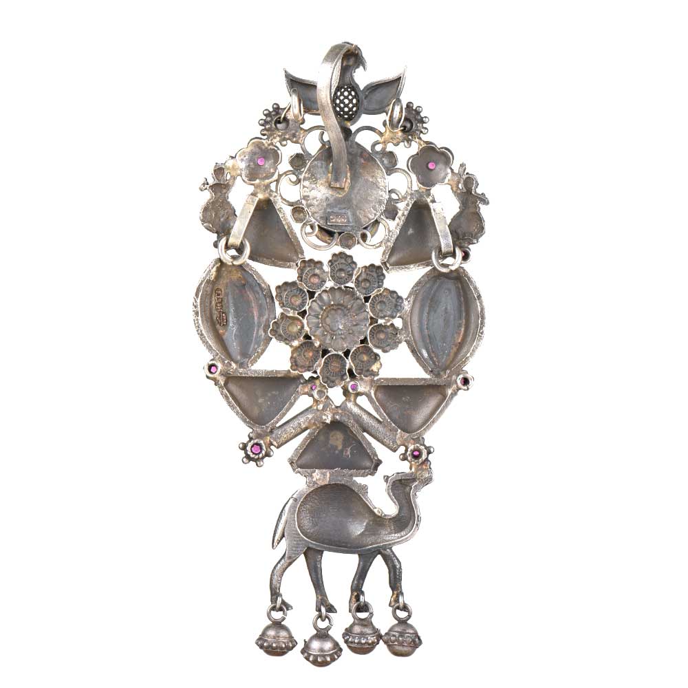 Solid silver pendant with carved bird on top dancing goddess statue on either side .The centre of the pendent is adorned by a big turquoise stone. It is further decorated with elephant face with camel statue in 92.5 Sterling Silver pendant. This designer pendant is sure to make a great addition to one's wardrobe.