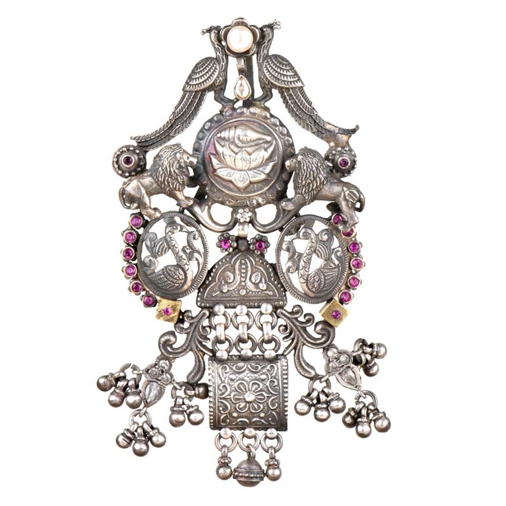 A gorgeous piece, with traditional motifs and stunning metalwork! This piece is sterling silver depicts Lions, Peacocks and Ducks surrounded by flowers and an ornate vine motif Lotus flower in the centre. Size for a man or women, this antique pendant is sure to make a great addition to one's wardrobe.
