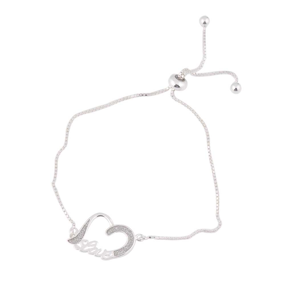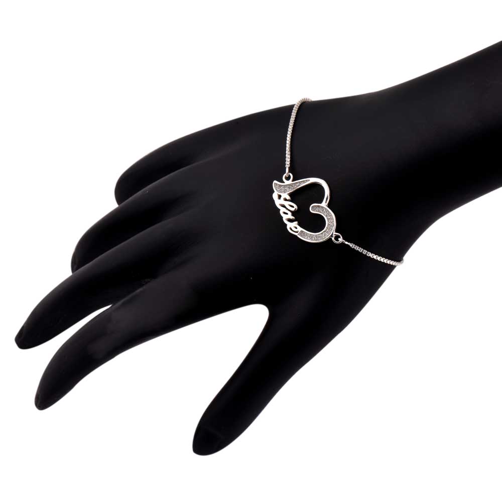 Very Romantic and feminine looking 92.5 Sterling Silver Bracelet with heart and love charm attached to a lovely chain that can be adjusted with the help of a single bead at the end . Gift it to someone you adore and love , present it to her on that special dinner date , on valentine, anniversary or birthdays.