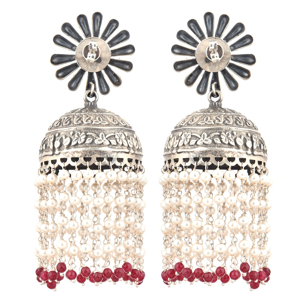Handcrafted fusion traditional and modern design 92.5 Sterling Silver Earrings with a big petals flower design and jhumki engraved with floral design and tassels made of small sterling silver beads finished with small red onyx beads attached to the jhumki. Perfect to be worn on an engagement, wedding, cocktail, reception party or other special function.