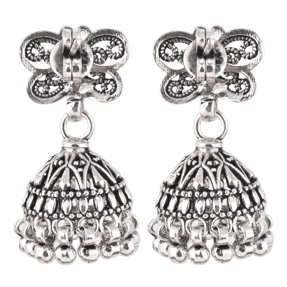 A unique looking 92.5 Sterling Silver Jhumkis Pair in Dome shape with butterfly engraved Stud on the top with hanging silver bells from our tribal jewellery collection. Wear it with a suit or a saree, for an ethnic yet classy look.
