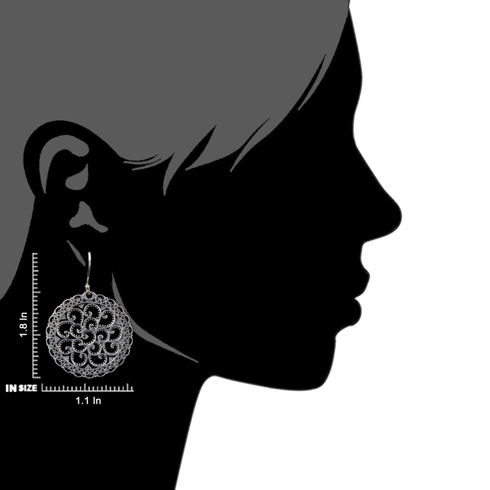 Stylish and fashionable handmade sterling silver drop earrings are the ideal gifts for birthdays, wedding and anniversary gift. These round Floral sterling silver dangle earrings are such fun to wear. Their darkened patina and highly polished pattern gives it a boho chic appeal.