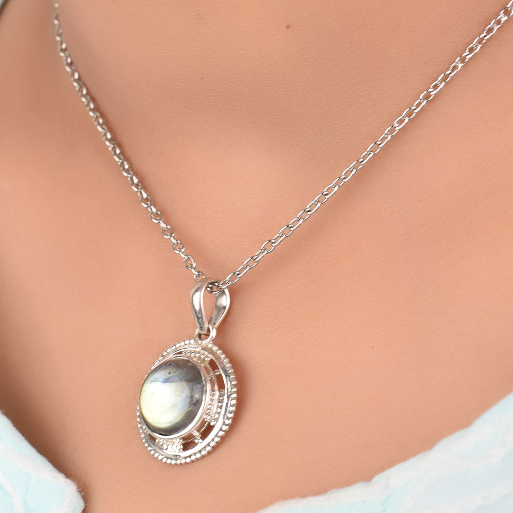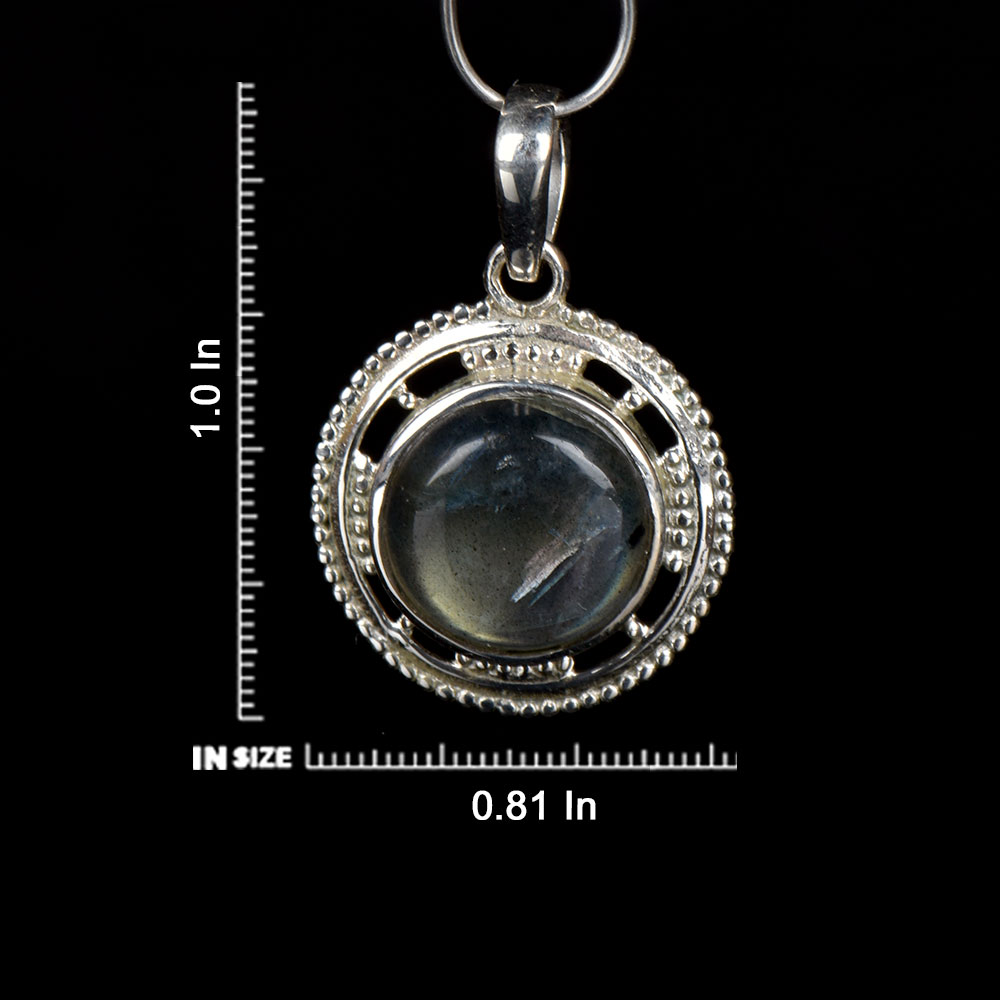 Glowing big round shaped Labradorite gemstones are highlighted by 92.5 Sterling Silver Pendant. They resonate a timeless and ancient aesthetic, and are perfect for everyday or a night out! Elegant bezel set pendant is handcrafted by expert artisans of India. Ideal gift for anniversary, Weddings and also for daily wear.