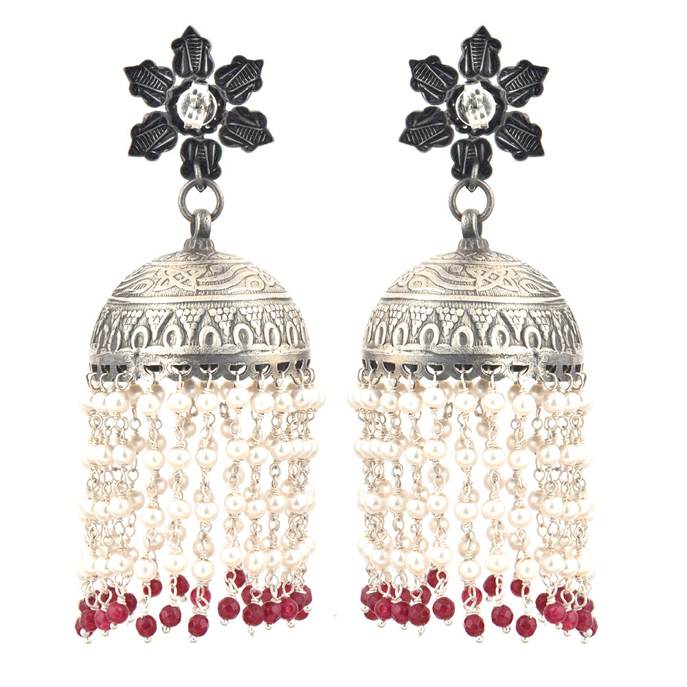 Long Chandelier 92.5 Sterling silver earrings with lotus flower studs and long hanging tassel made of silver beads and finished with a layer of red onyx beads .The beauty of these earrings is that it can be worn with traditional as well as modern wear. Wear it for Diwali, wedding, engagements and other auspicious functions.