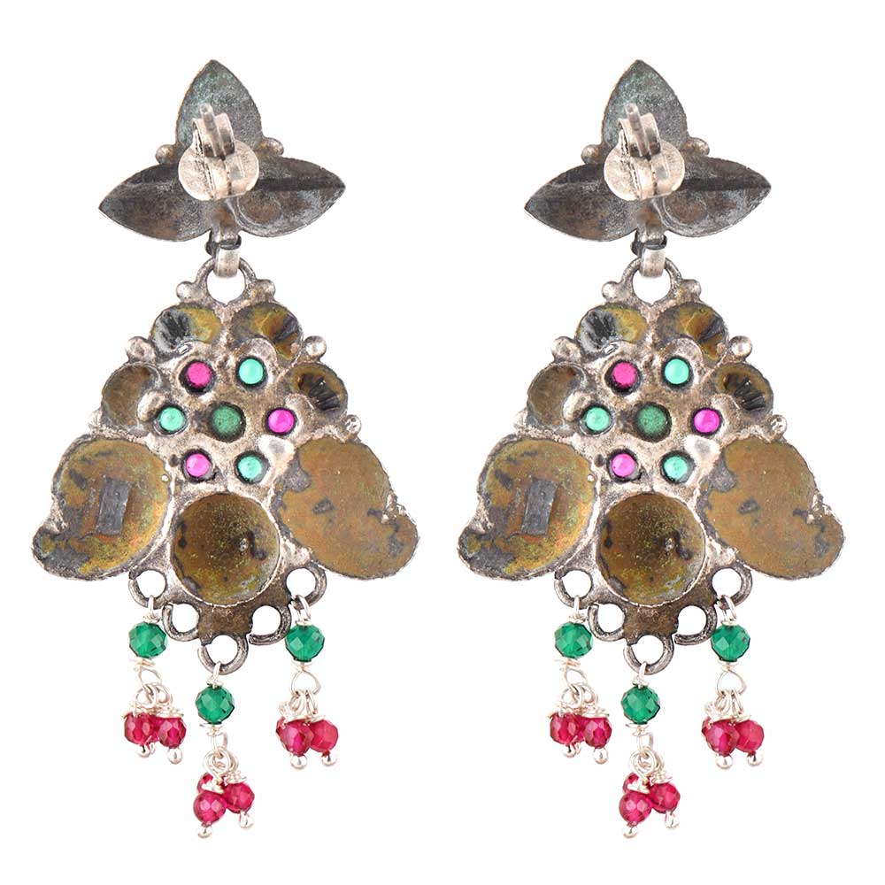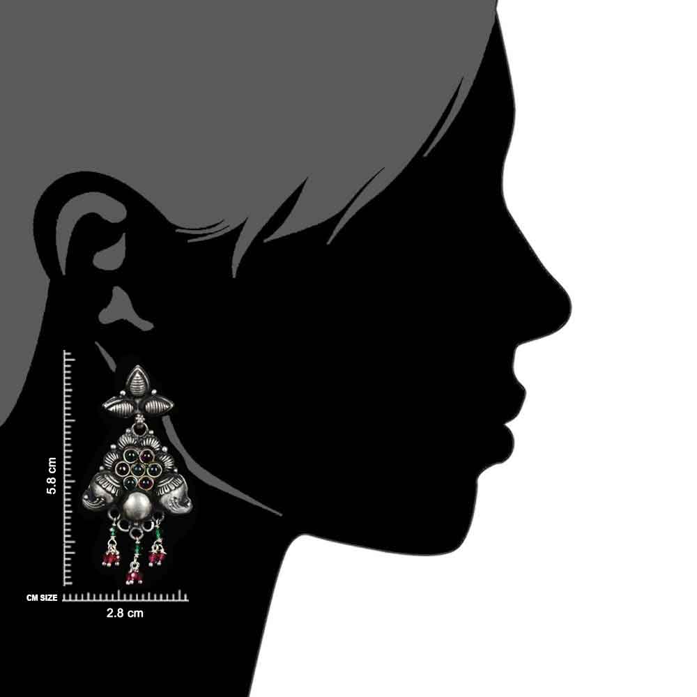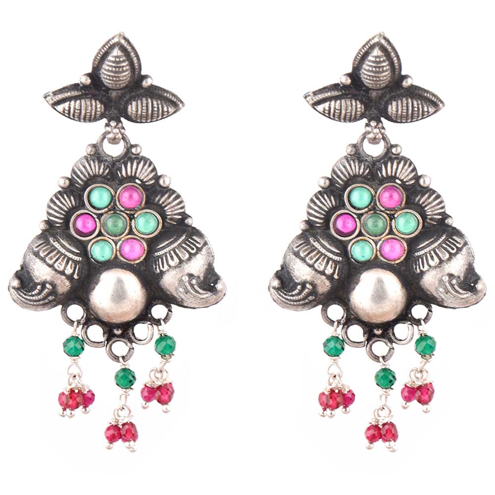 92.5 Sterling Silver Earrings made with various multicolored stones like green agate and pink jade quartz with conch and leafy motifs and tassels to give it a classy and traditional look.