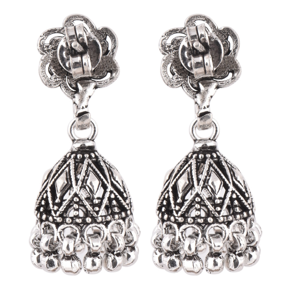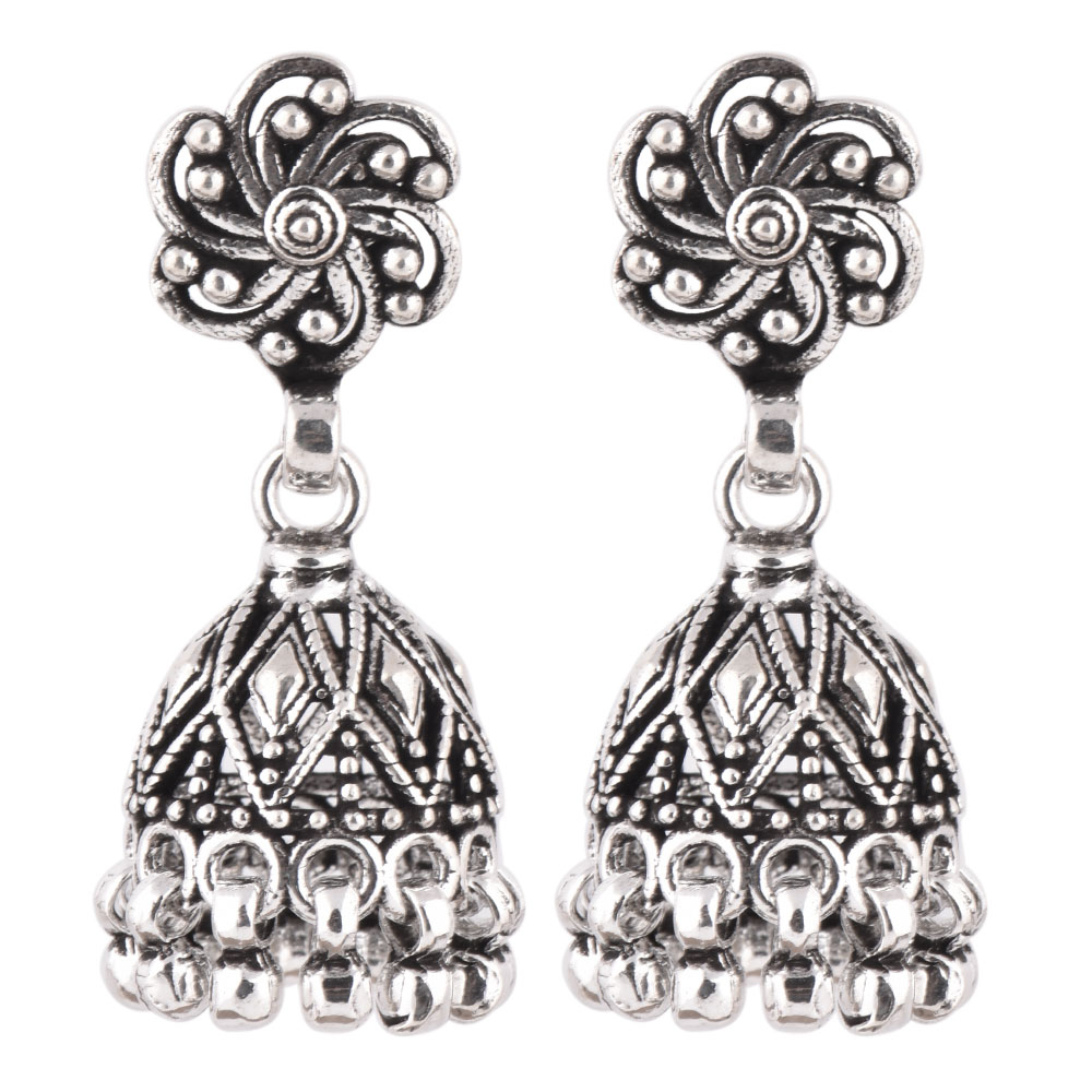 A unique looking 926 Sterling Silver Jhumkis Pair in Dome shape with floral motif on the top with hanging silver bells from our tribal jewellery collection can adorned beautifully with any Indian outfit. Ideal for Work And Casual Wear.