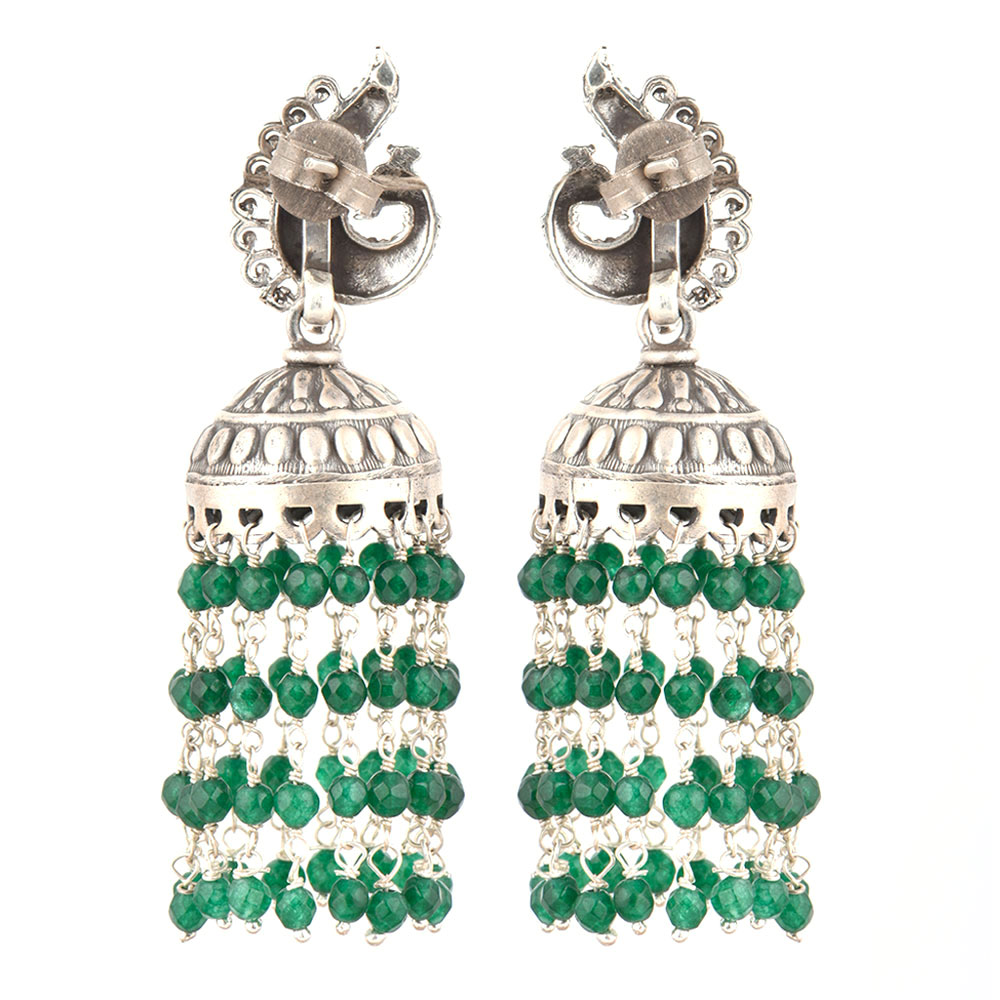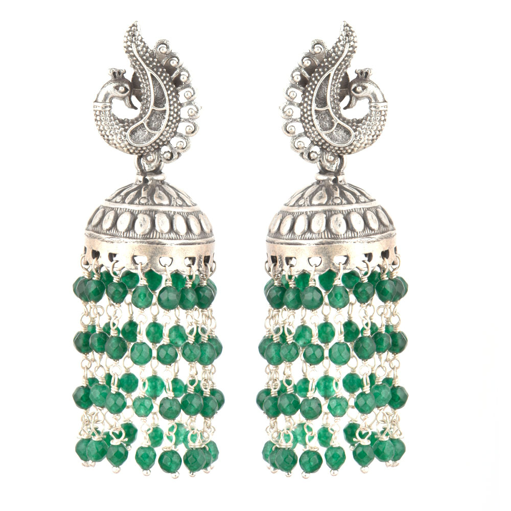 92.5 Sterling Silver Earrings are made of engraved peacock on the sterling silver stud attached to hanging chandelier tassels made of tiny green onyx stone and silver attachments that gives a cascading effect to the earrings. Team it up with a traditional attire like a heavy embroidered sari or lehenga and the best part is that it suits girls and women perfectly.