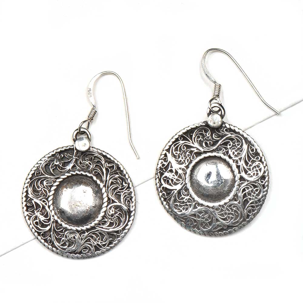 Handmade 92.5 sterling silver earrings with a round ball in centre surrounded by filigree floral pattern is perfectly paired with traditional as well as western wear. Gift it to your near and dear ones on special occasions and ceremonies. Suitable for girls and women of all age group.